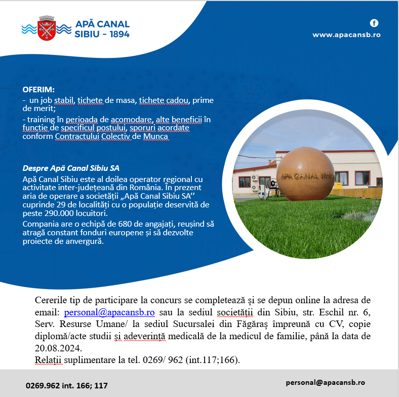 Cererile tip de participare la concurs se completează și se depun online la adresa de mail personal@apacansb.ro sau la sediul societăţii, str. Eschil nr.6, Serv.Resurse Umane/ la sediul Sucursalei din Făgăraș împreună cu CV, copie diplomă studii şi adeverinţa medicală de la medicul de familie, până la data de 20.08.2024. Relaţii suplimentare la tel. 0269/ 222916 (int.117 sau 166).