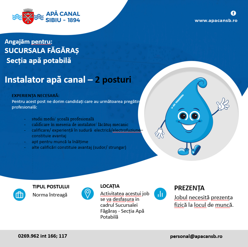 Apă Canal Sibiu angajează personal pentru SUCURSALA FĂGĂRAȘ – SECȚIA APĂ POTABILĂ: