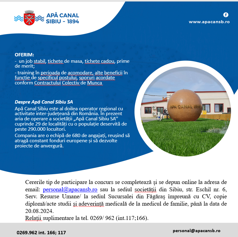 Cererile tip de participare la concurs se completează și se depun online la adresa de mail personal@apacansb.ro sau la sediul societăţii, str. Eschil nr.6, Serv.Resurse Umane/ la sediul Sucursalei din Făgăraș împreună cu CV, copie  diplomă studii şi adeverinţa medicală de la medicul de familie, până la data de 20.08.2024. Relaţii suplimentare la tel. 0269/ 222916 (int.117 sau 166).