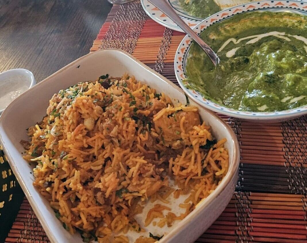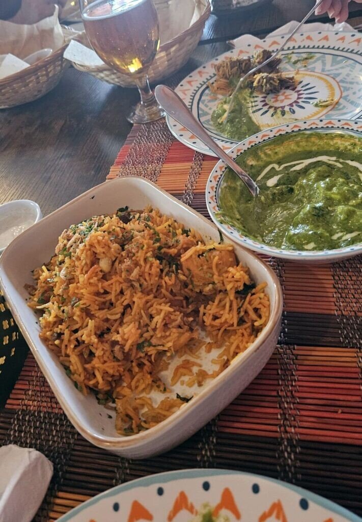 Chicken Biryani este una din specialitățile bucătarului. Așa scrie la meniu. Am testat și într-adevăr aici bucătarul și-a arătat clasa. Combinația de pui marinat cu orezul basmati amestecat cu alune caju, stafide, mentă, coriandru a dus cerul gurii pe culmi de mult uitate. Să nu uit de Naanul simplu și cel cu usturoi. Un fel de pizza pane cum îi spun ai noștri prin restaurante. Un bun element pentru cei care au nevoie și de un fel de pâine la acest gen de mâncare. Eu am spus pas, dar alții de la masă au dorit să servească.