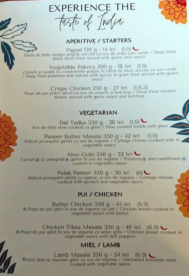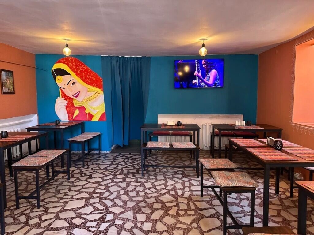 Locația extrem de mică de sub Podul Minciunilor, cu ușa care îi face pe cei mai înalți să se aplece de parcă intră în biserică este curată, cu puține mese și decorată a la India. Adică mai mult a la Bollywood. Un amestec de televizor pe perete cu muzică, un desen făcut de cineva care nu se prea are cu arta rupestră, dar care a vrut să scoată în evidență India printr-o femeia indiancă. Mese simple, cu bănci cam 6, deci nu este loc de multă lume. Dar clienți erau. Cât am stat acolo a fost tot plin, iar unii clienți au fost refuzați pentru că nu mai era spațiu. Și era doar ora prânzului târziu….