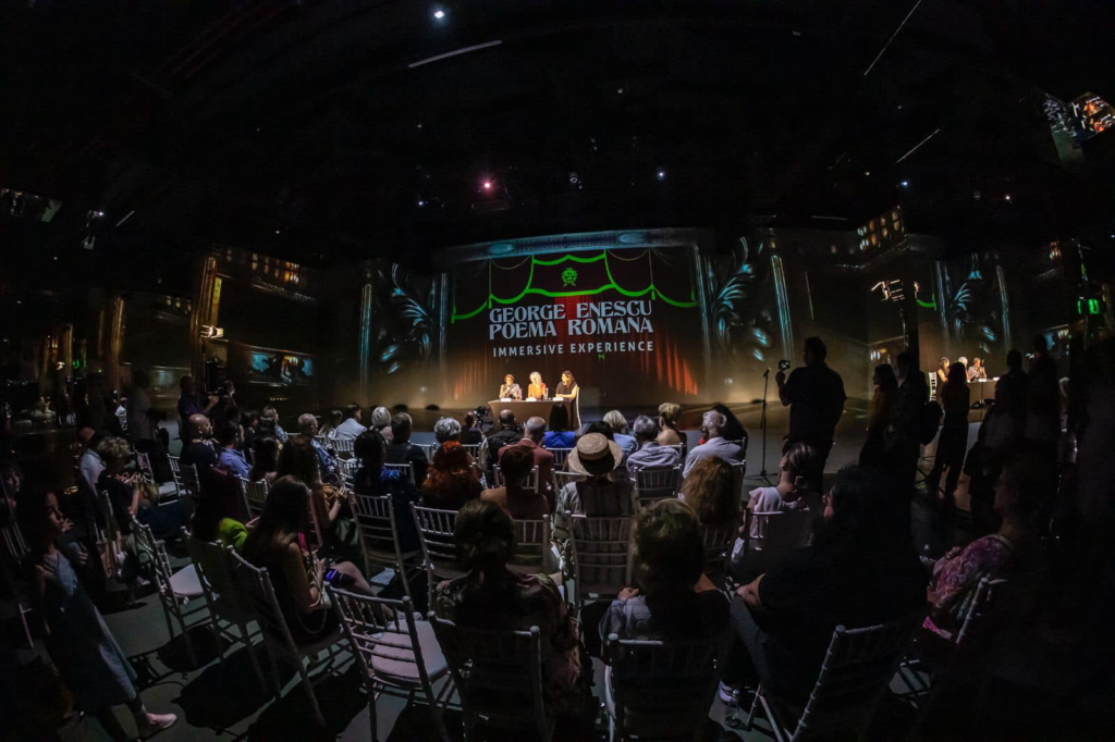 Vreau să-i felicit pe toți cei au gândit și au organizat spectacolul imersiv de astăzi, care m-a impresionat. Felicit Artexim, o felicit pe doamna Cristina Uruc și întreaga echipă pentru acest spectacol inedit, care n-ar fi fost posibil fără sprijinul Muzeului Național „George Enescu”, cel ce a pus la dispoziție materiale din arhive. Felicit de asemenea colaborarea cu JTI – Immersive Experience și îi mulțumesc doamnei Gilda Lazăr, Director Corporate Affairs și Comunicare JTI România, Moldova și Bulgaria pentru prezența de astăzi, Les Ateliers Nomad pentru creația și producția video și salut sprijinul acordat de MINA – Museum of Immersive New Art, care a găzduit acest eveniment.