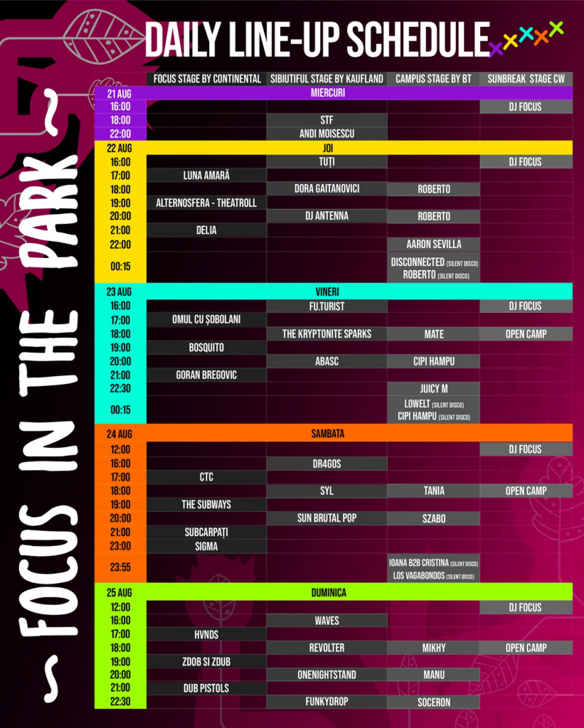 Cel mai cunoscut festival outdoor de acest gen, Focus in the Park va avea loc în perioada 21-25 august, fiind un eveniment cofinanțat de Primăria Sibiu prin Agenda Culturală 2024.
