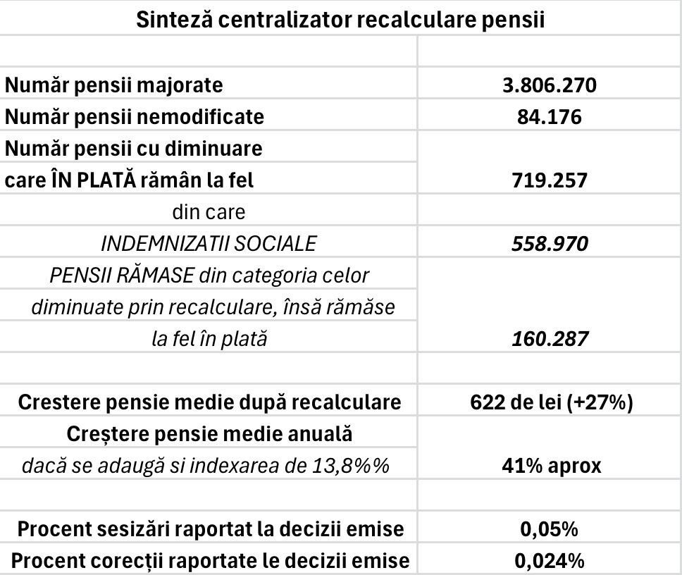 Din totalul de 99.145 de pensionari din județul Sibiu, 83.451 vor avea o pensie mai mare de la 1 septembrie 2024. Doar 15.694 de beneficiari vor primi aceeași pensie ca și acum. Creșterea medie a pensiilor, după recalculare, este de 524 de lei.