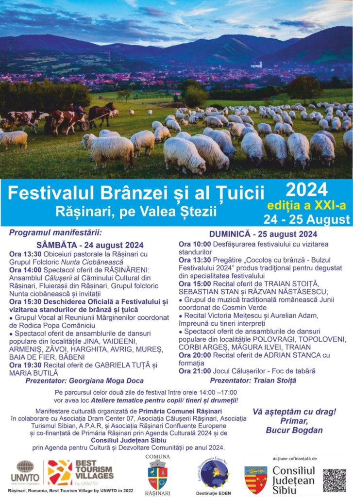 „Suntem la cea de-a 21-a ediție a Festivalului Brânzei și al Țuicii și ne bucurăm că acum, la începutul Festivalului, deja multă lume a venit și a încercat brânzeturile de la producătorii care ne-a onorat în acest an. Lumea se bucură de spectacolul care a început pe scenă iar cei care doresc să guste mâncărurile din zona Rășinariului și a Mărginimii Sibiului sunt invitați la terase, unde pot degusta, în special mâncăruri pe bază de carne de oaie, brânză și mămăligă” – a declarat Bogdan Bucur, primarul comunei Rășinari.