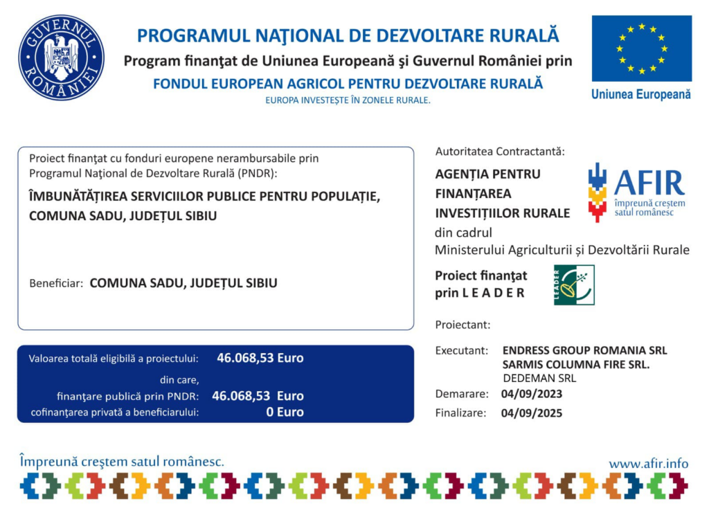 Încă un proiect implementat cu succes și fără corecții financiare! Miercuri, 28 august 2024, a avut loc vizita în teren și închiderea proiectului „Îmbunătățirea serviciilor publice pentru populație, comuna Sadu, județul Sibiu”, finanțat prin AFIR- Agenția pentru Finanțarea Investițiilor Rurale.