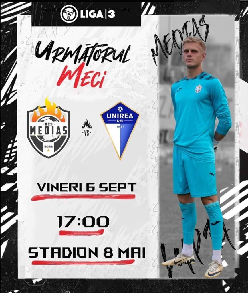 ACS Mediaș – FC Unirea Dej se joacă pe Stadionul Gaz Metan 2 (8 Mai), vineri, de la ora 17.00. Partida va fi live pe pagina de Facebook ACS Mediaș.