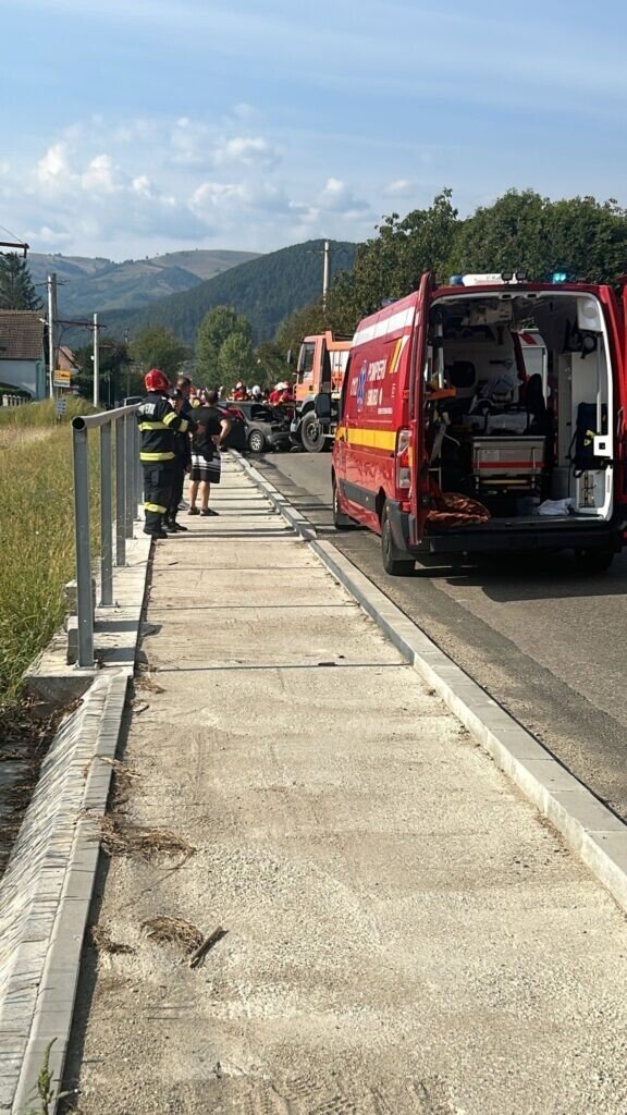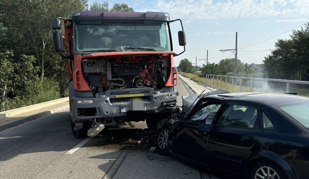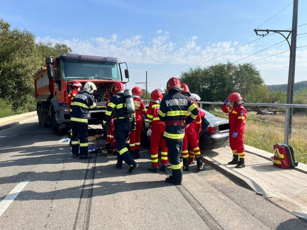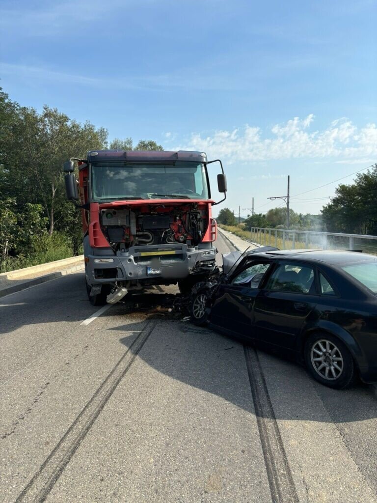 Traficul rutier a fost blocat total pe DJ 106A, la intrarea în localitatea Rășinari. Aici s-a produs o coliziune violentă între o mașină și o autobasculantă.