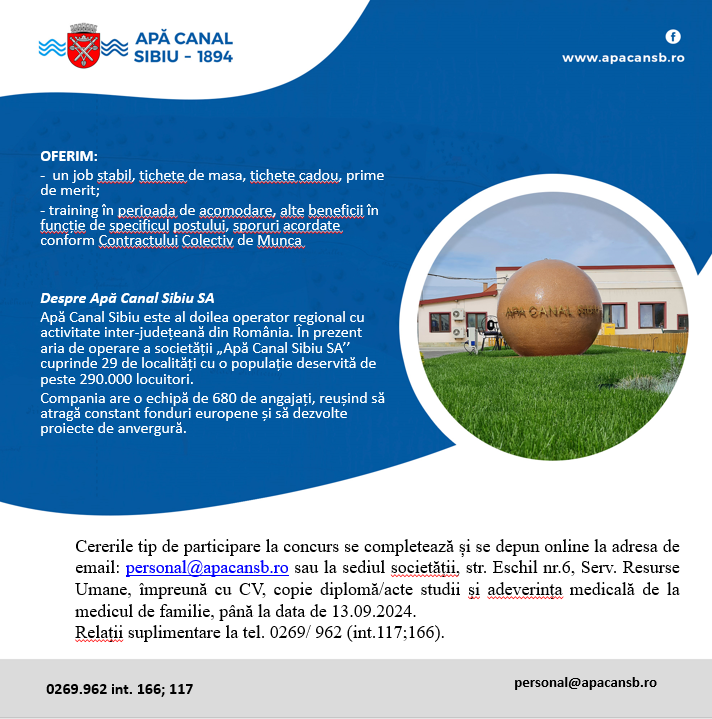Cererile tip de participare la concurs se completează și se depun online la adresa de mail personal@apacansb.ro sau la sediul societăţii, str. Eschil nr.6, Serv.Resurse Umane, împreună cu CV, copie diplomă studii şi adeverinţa medicală de la medicul de familie, până la data de 13.09.2024. Relaţii suplimentare la tel. 0269/ 222916(int.117 sau 166).