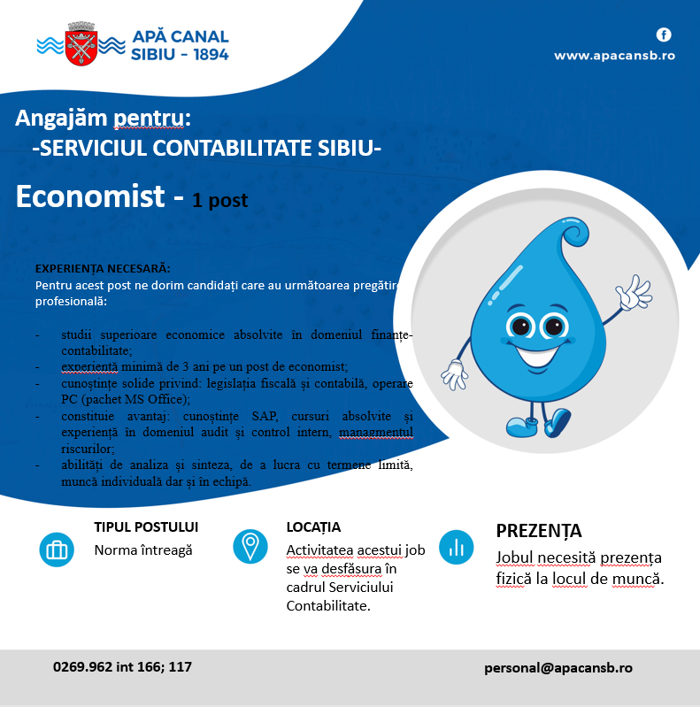 APĂ CANAL SIBIU S.A. angajează pentru Serviciul Contabilitate: