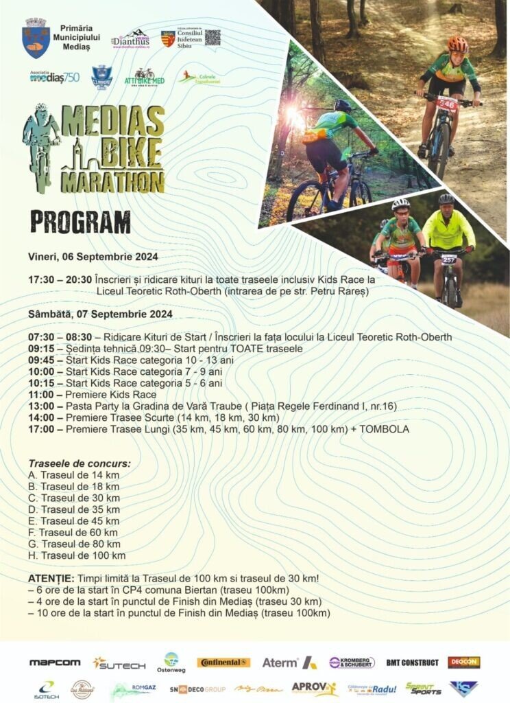 Cu ocazia desfășurării competiției „Mediaș Bike Marathon“ 2024, vor fi instituite în municipiul nostru anumite măsuri speciale în ceea ce privește circulația rutieră. Astfel, accesul pe Str. Johannes Honterus va fi restricționat vineri, 6 septembrie 2024, de la ora 16:00 și până la ora 21:30, iar în data desfășurării concursului – sâmbătă, 7 septembrie, restricțiile de trafic se vor aplica pe străzile Johannes Honterus și Petru Rareș, de la ora 6:00 până la ora 19:00.