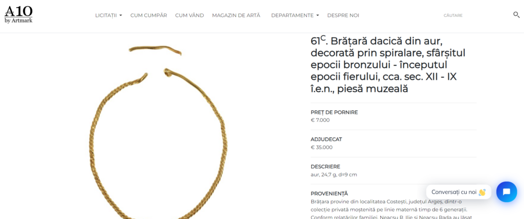 Felicităm colecționarul care a dorit să achiziționeze această piesă și mulțumim Casei de Licitații A10 by Artmark pentru colaborare și dialog. Vom anunța în curând data de la care această brățară va putea fi vizitată la Sibiu. Ne pregătim ca piesa să fie expusă la Brukenthal într-un modul expozițional distinct, împreună cu texte și cu date despre aceasta și proveniență – așadar îi vom rezerva un loc aparte, astfel încât brățara să poată fi vizitată în toată splendoarea sa.