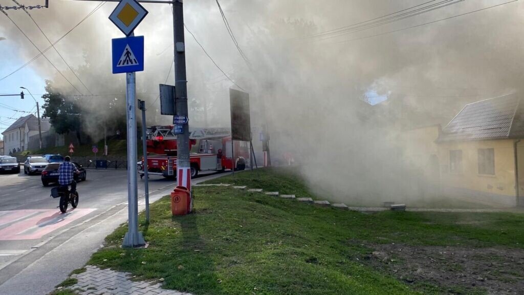 Pompieri Detașamentului Mediaș intervin de urgență pe strada Horea din municipiul Mediaș pentru stingerea unui incendiu.