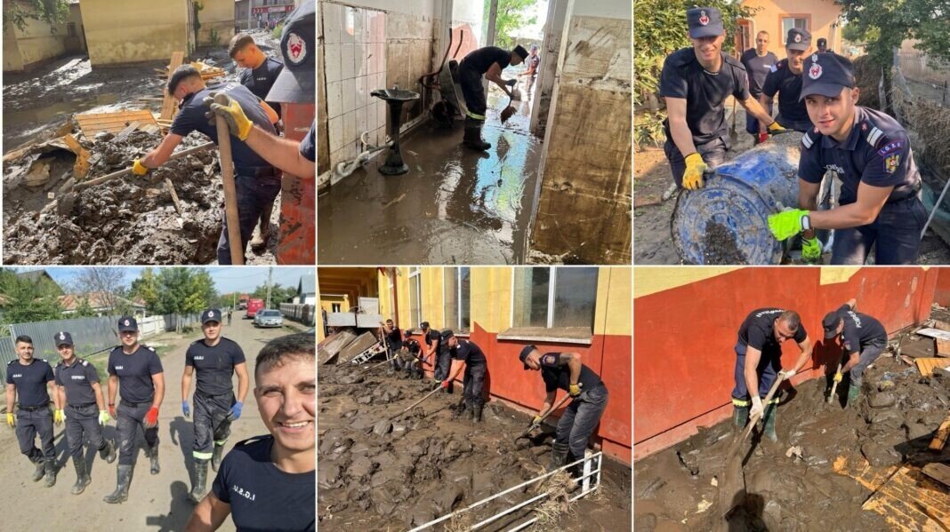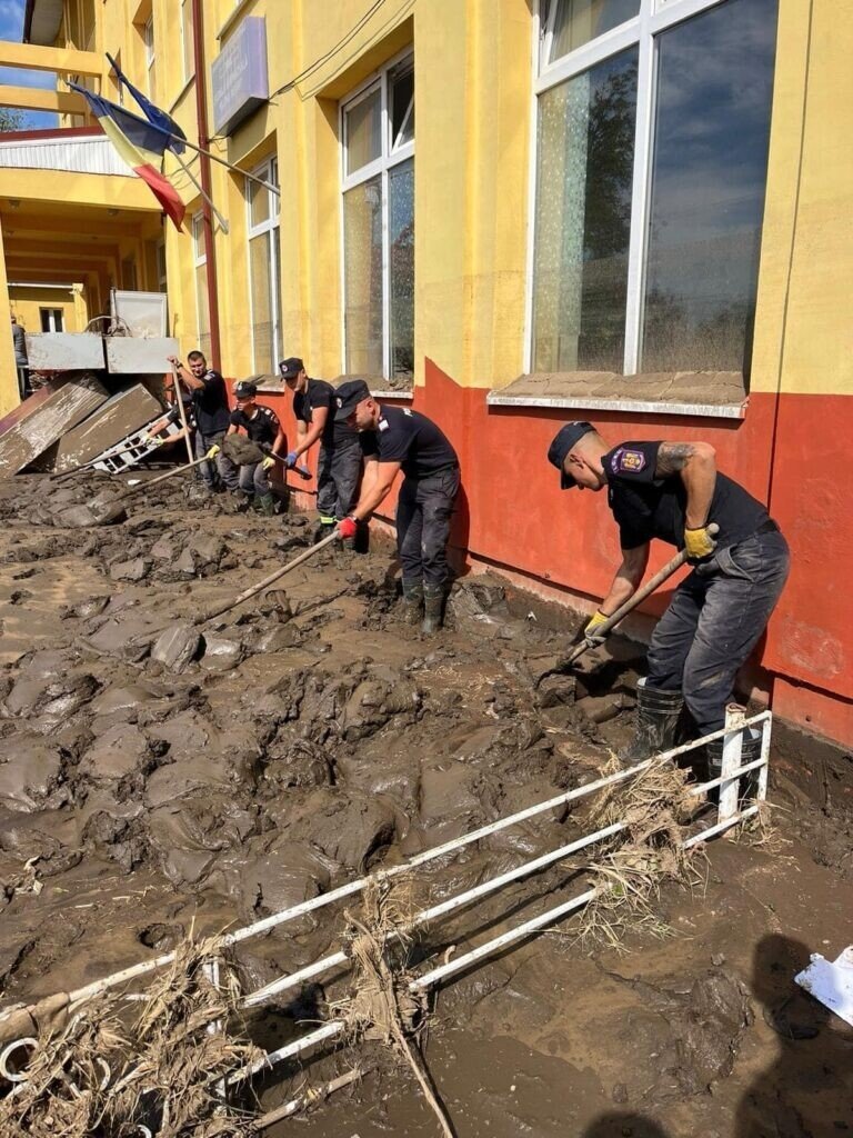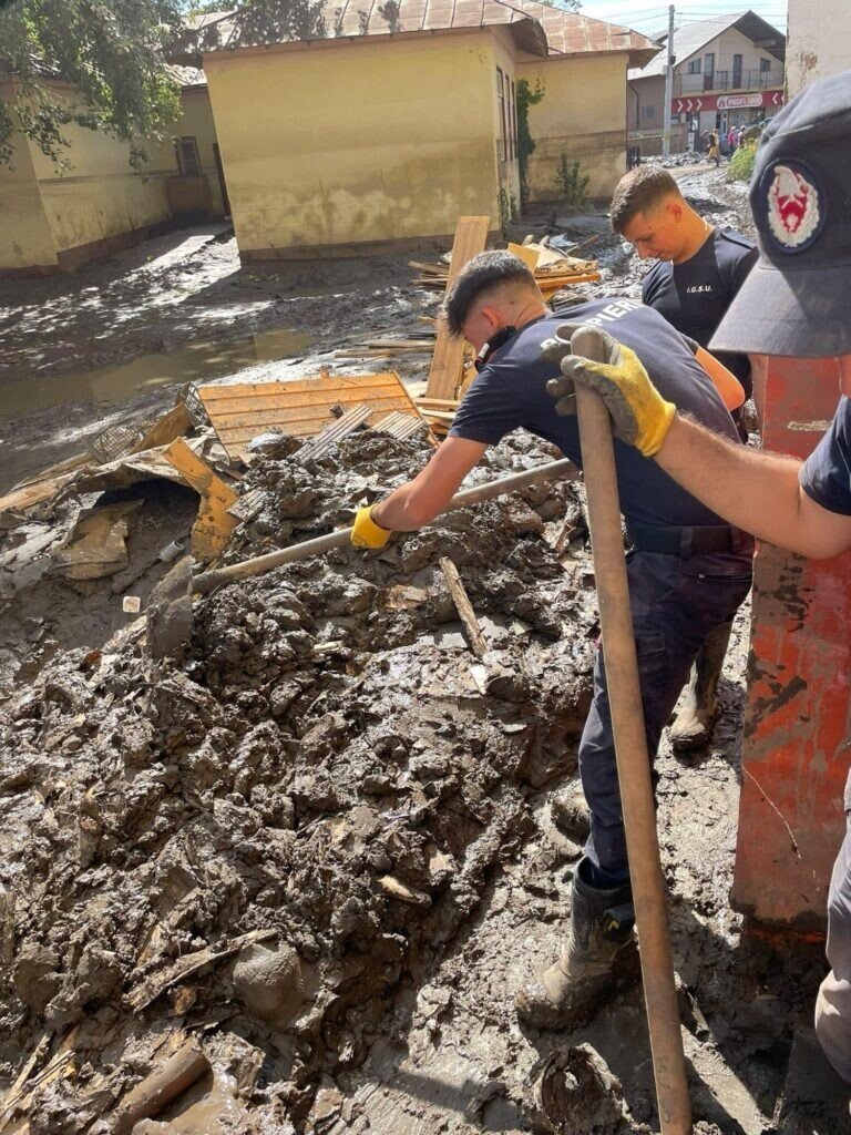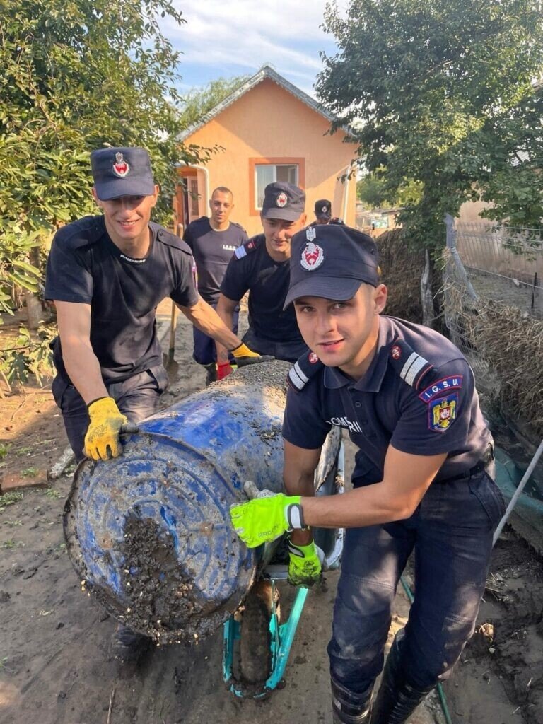 Ziua de astăzi a început devreme și a fost una foarte intensă, aceștia acționând în localitatea Costache Negri din județul Galați. Aici, pompierii sibieni au curățat de nămol străzile, curțile și interiorul caselor afectate de inundații.