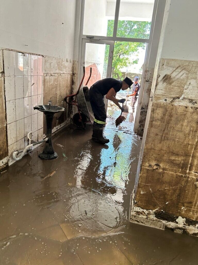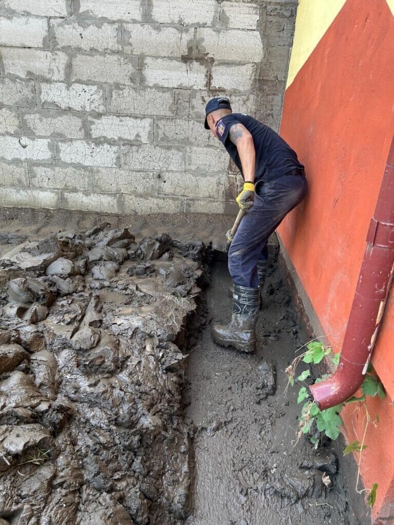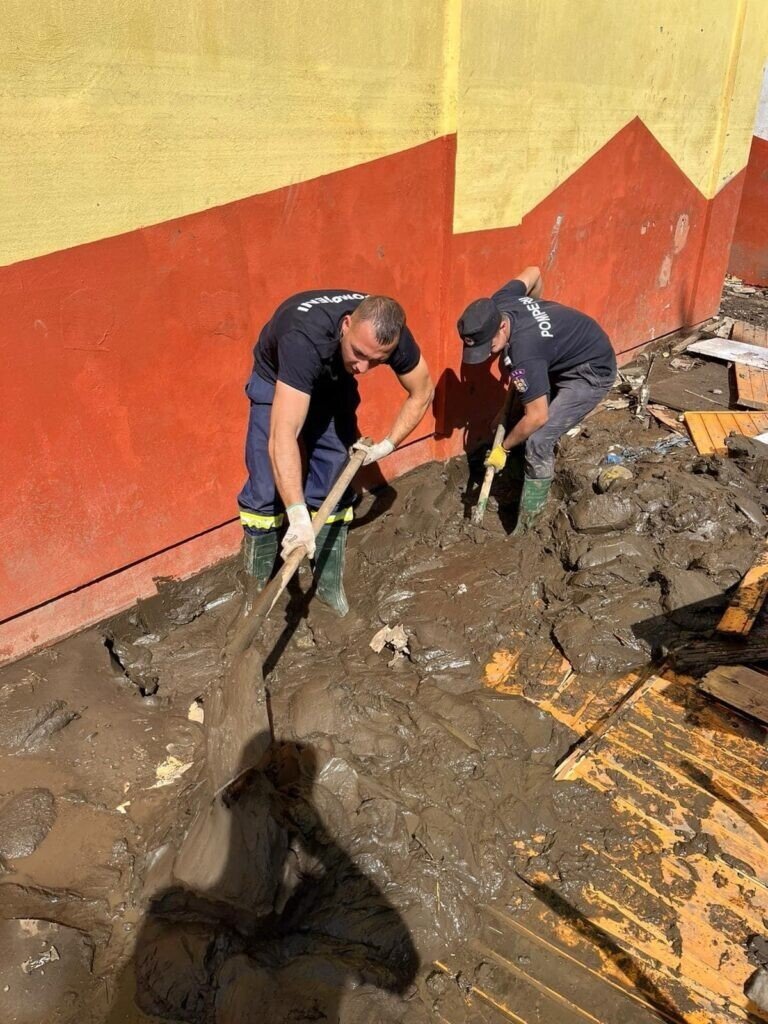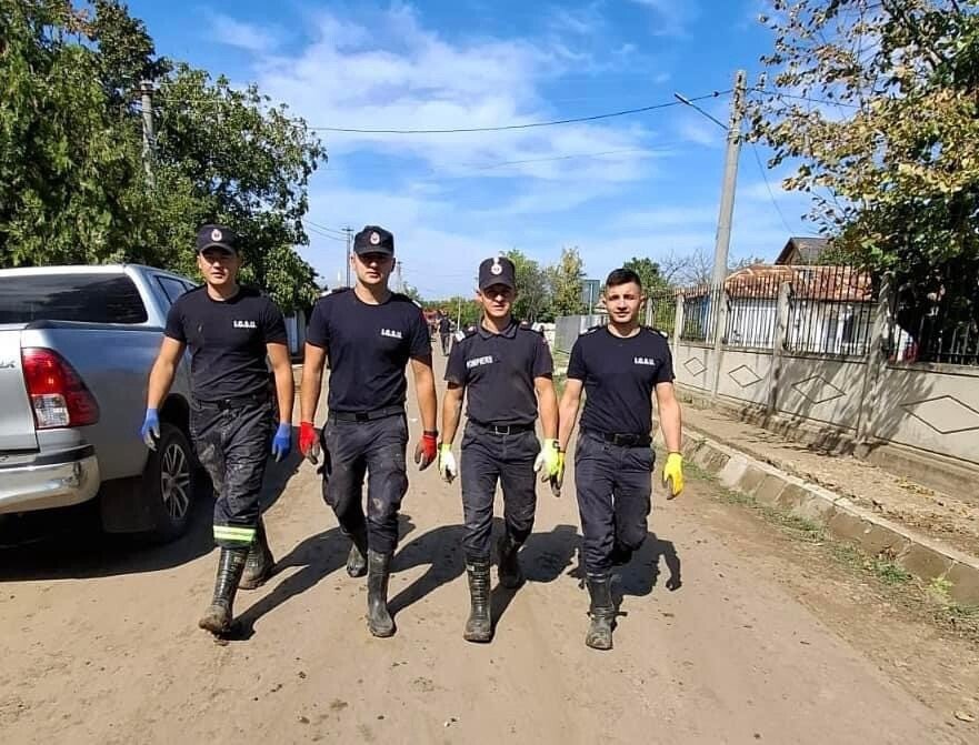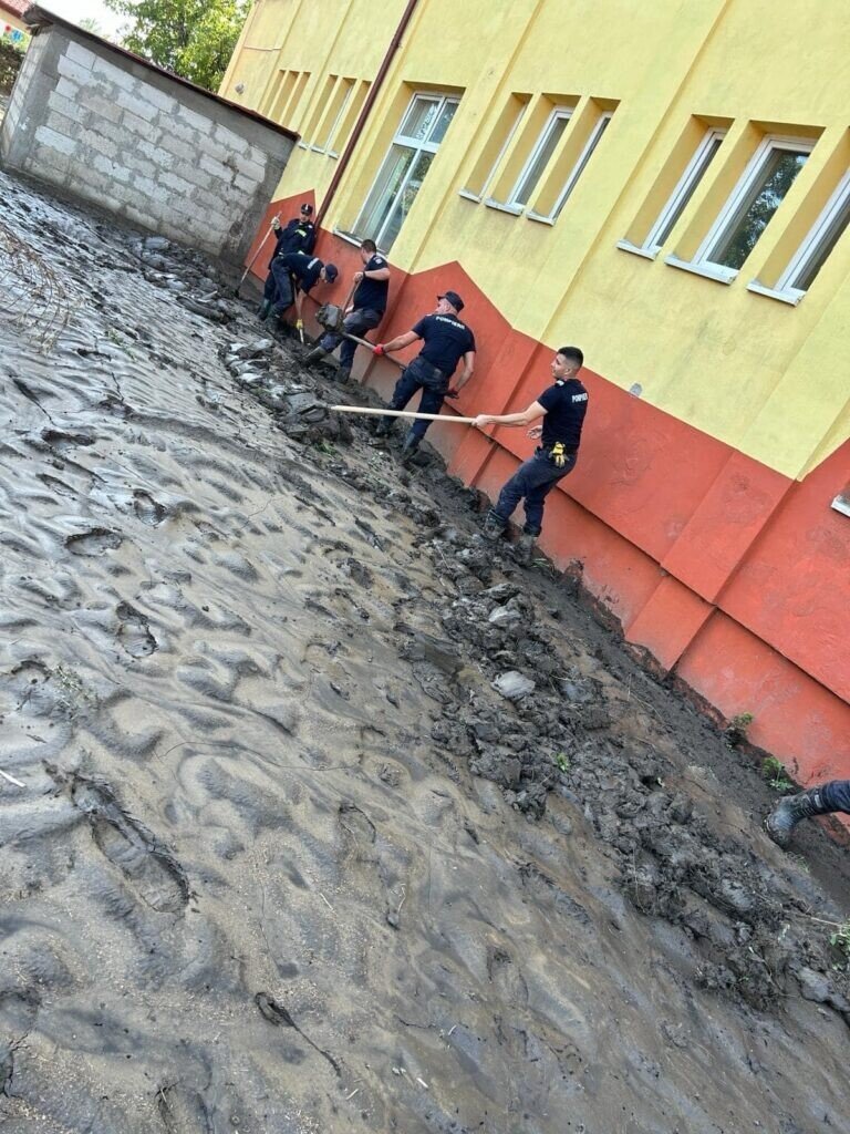 Ziua de astăzi a început devreme și a fost una foarte intensă, aceștia acționând în localitatea Costache Negri din județul Galați. Aici, pompierii sibieni au curățat de nămol străzile, curțile și interiorul caselor afectate de inundații.