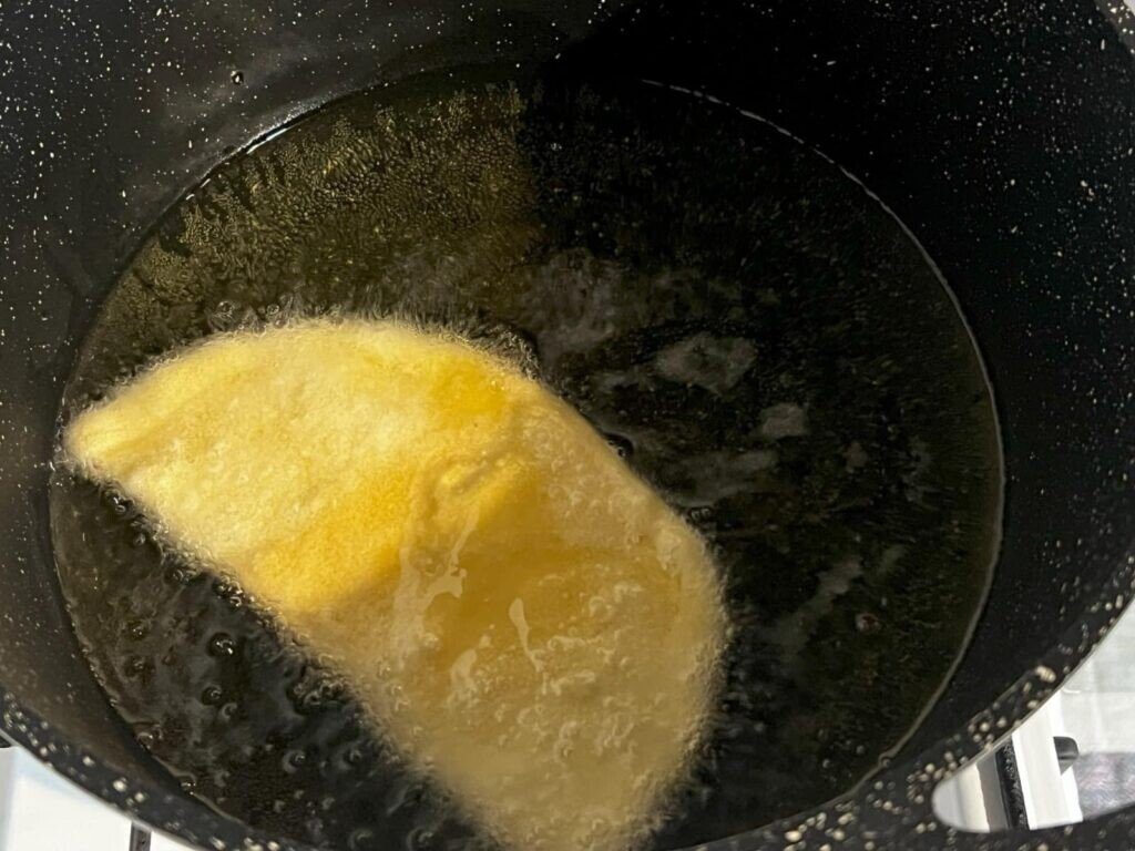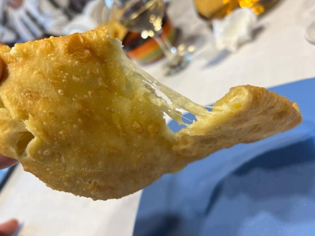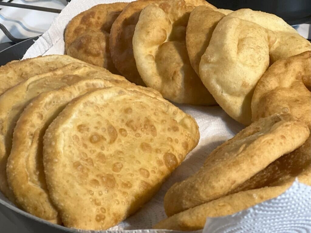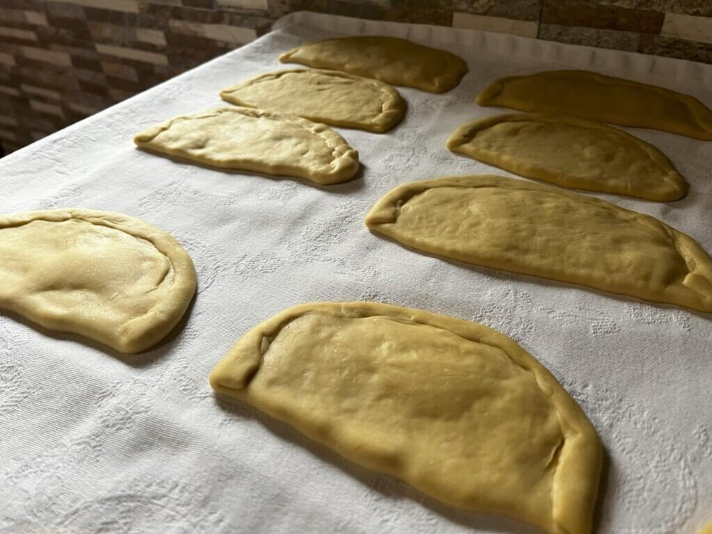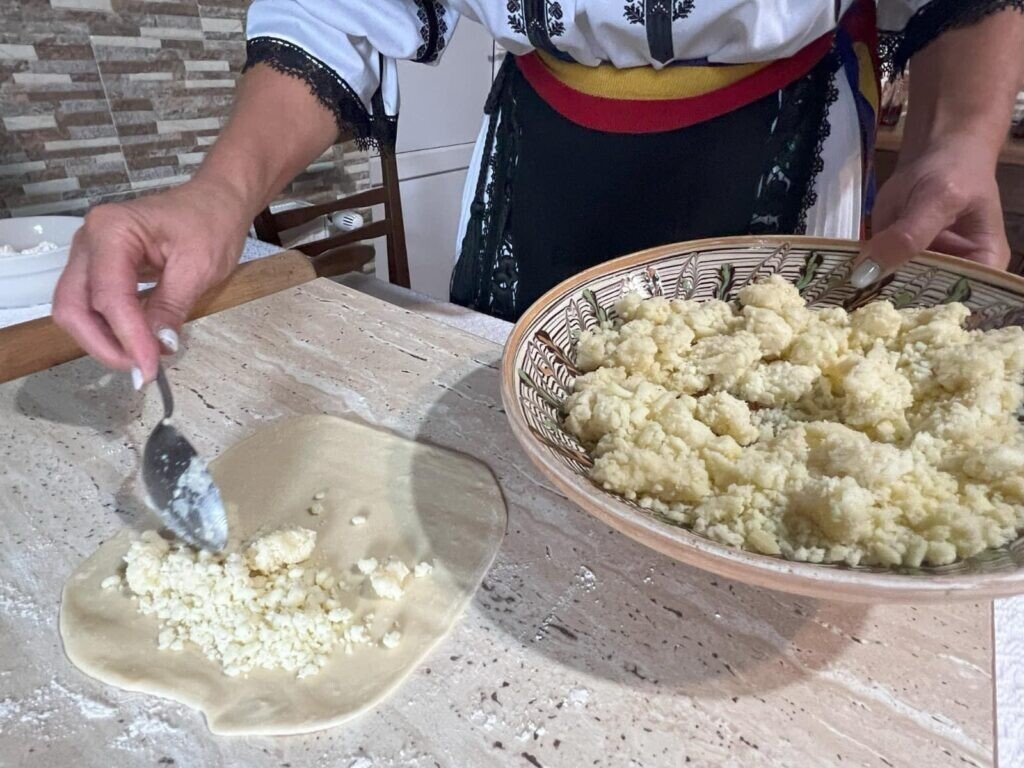 Ieșite de sub sucitor și burdușite cu brânză, plăcintele se odihnesc preț de câteva minute pe un ștergar alb. Se pregătesc pentru un nou popas în ceaunul cu ulei încins. „Nu le las mult, doar până prind culoare”.