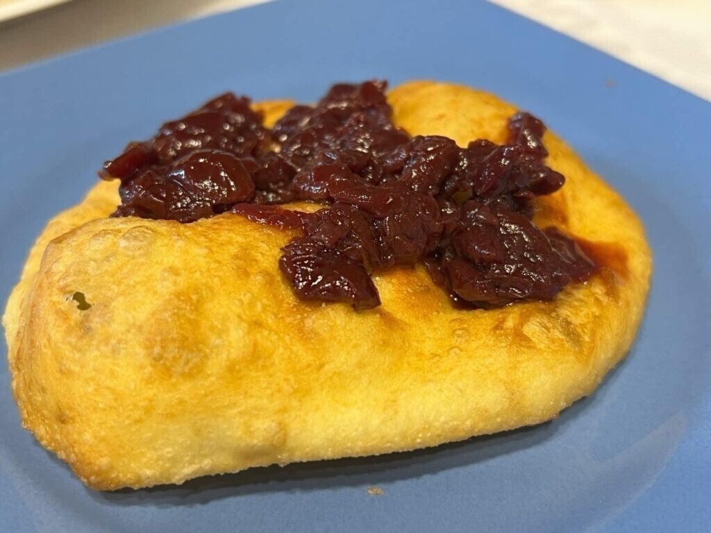 Plăcintele au și o variantă mai… ușurică: „Aluatul întins îl prăjim în ulei, iar apoi așternem pe el strat gros de dulceață. Hai, încercați”, spune Aneta Crăciun, întinzând o bucată fierbinte de aur „trândos”, devenit crocant, și un borcan cu dulceață de vișine, făcută din fructele pomului ce se ițește prin geamul bucătăriei, alături de alți confrați din livada familiei.
