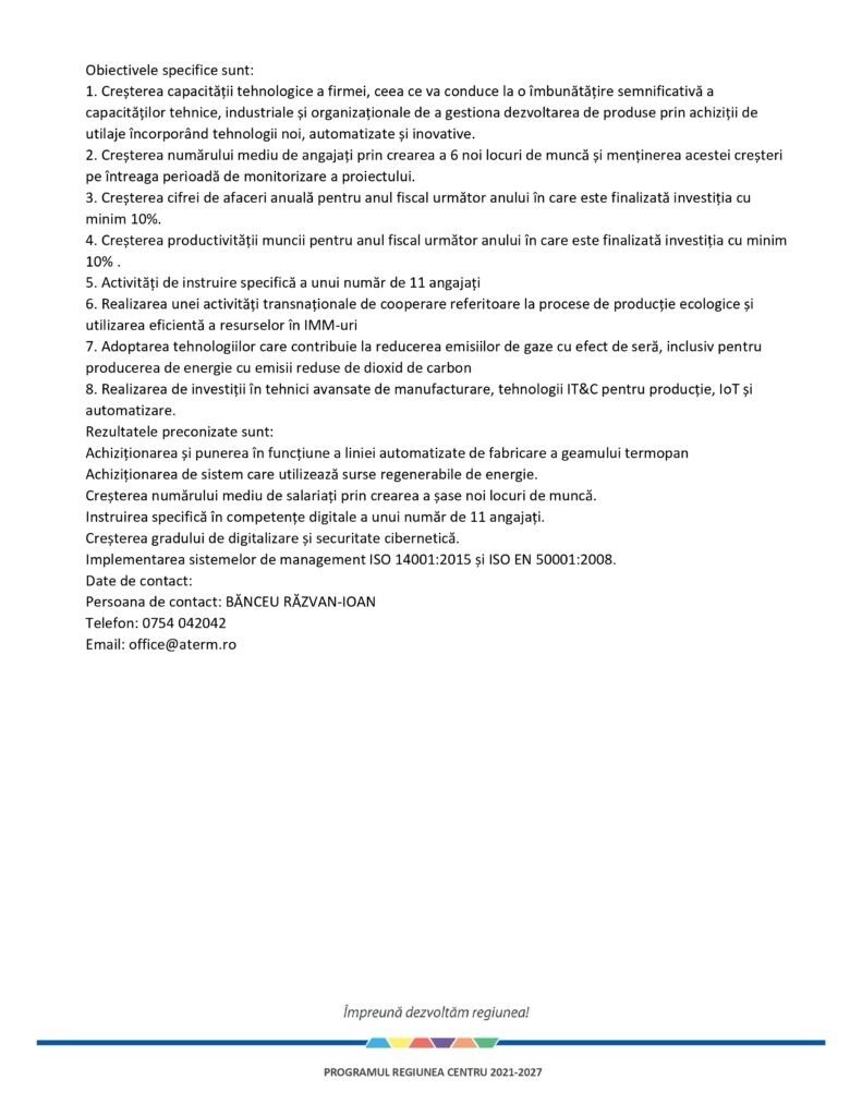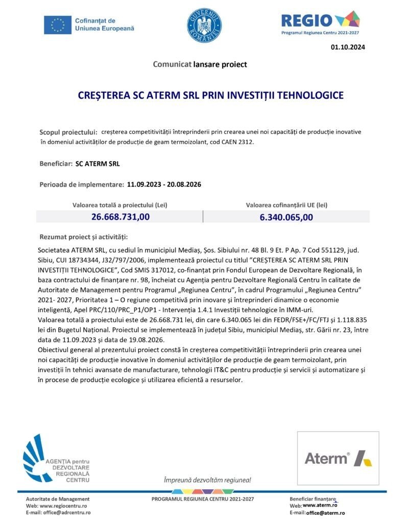 Comunicat de presă: CREȘTEREA SC ATERM SRL PRIN INVESTIȚII TEHNOLOGICE