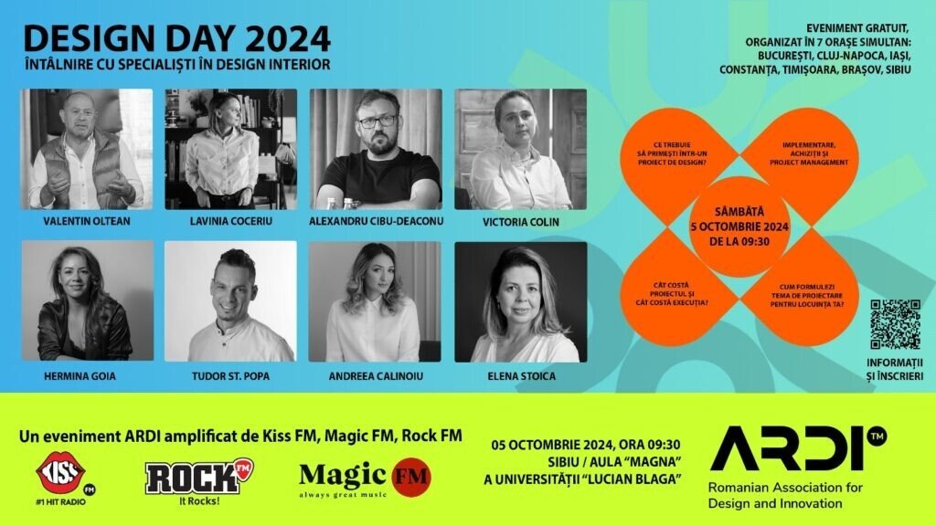 DESIGN DAY, singurul eveniment dedicat designului de interior care se desfășoară simultan în 7 orașe din România, îi așteaptă sâmbătă, 5 octombrie, pe toți cei care își amenajează locuința sau care sunt pasionați de design. La Sibiu, evenimentul are loc la Aula Magna a ULBS (Facultatea de Medicină) începând cu ora 9:30.