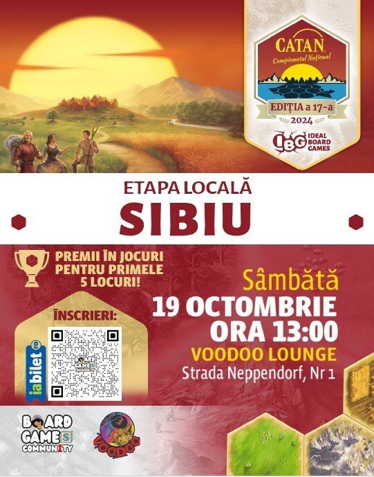 Înainte de această etapă națională, Board Games Community Sibiu organizează pe 19 octombrie 2024, la Voodoo Pub, o etapă locală de calificare. Evenimentul va începe la ora 13:00, și promite o atmosferă competitivă, dar prietenoasă, pentru toți pasionații de Catan din zonă. Cei care doresc să participe pot achiziționa biletele direct de pe iaBilet.ro.