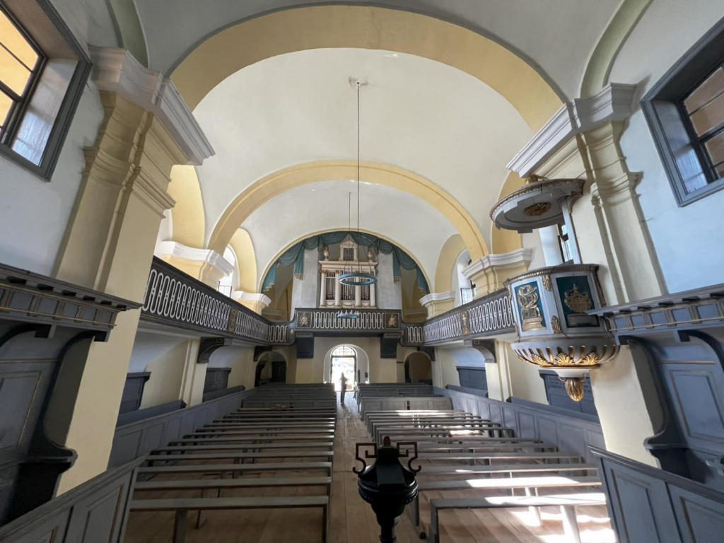 Odată ce pășești în biserică, Isus te privește dintr-un tablou pictat de Franz Neuhauser jr., artist vienez despre care se spune că baronul Brukenthal l-a convins să se mute la Sibiu.