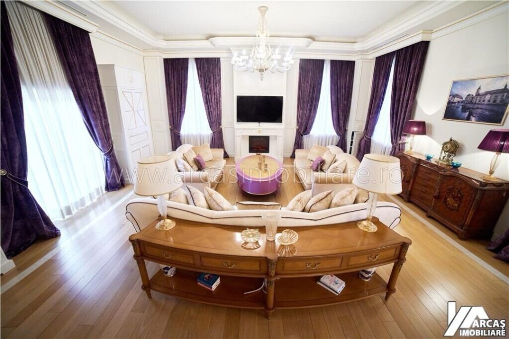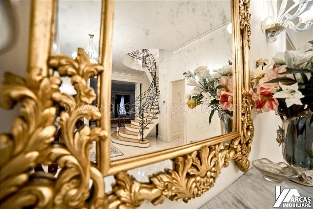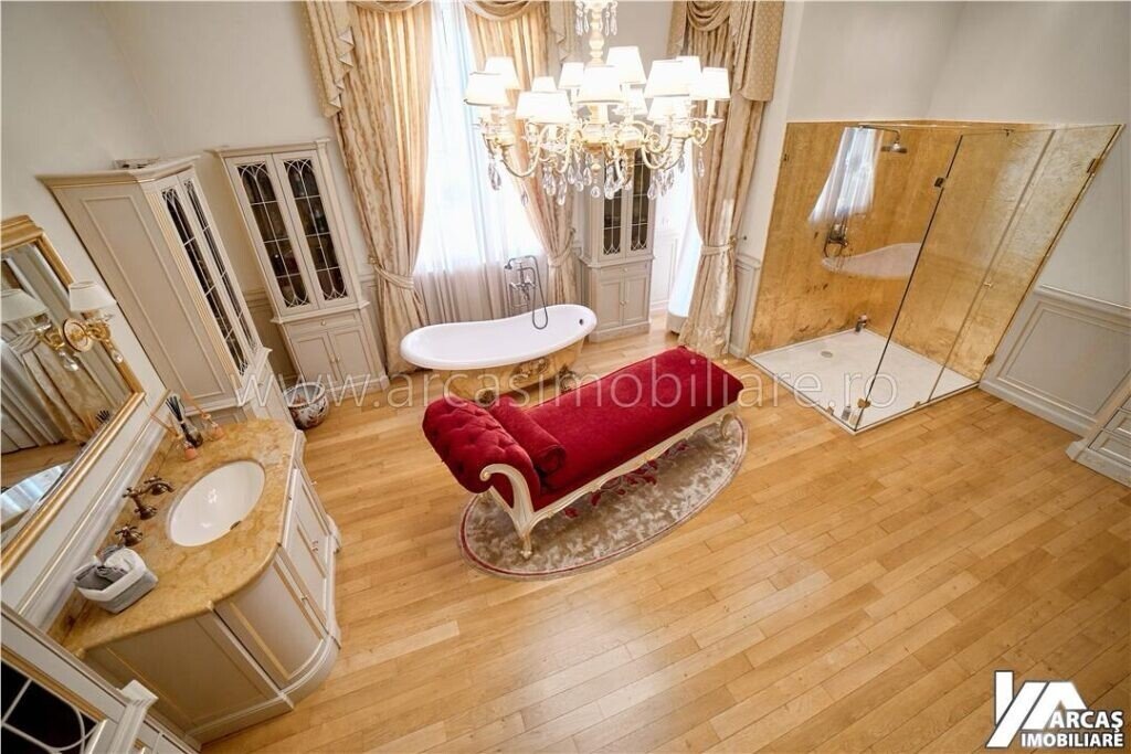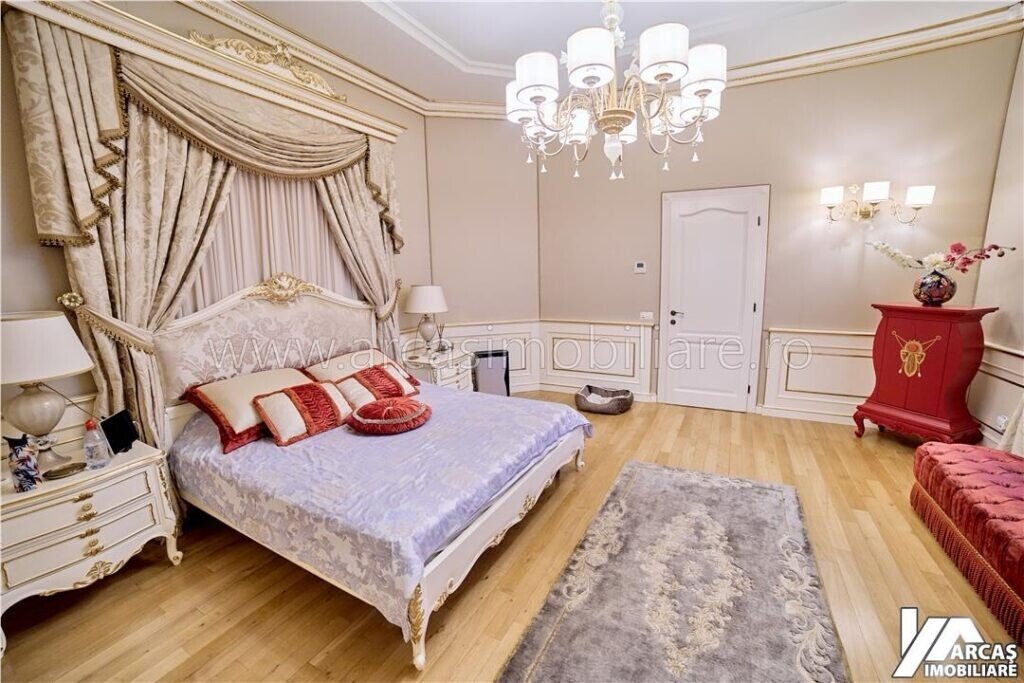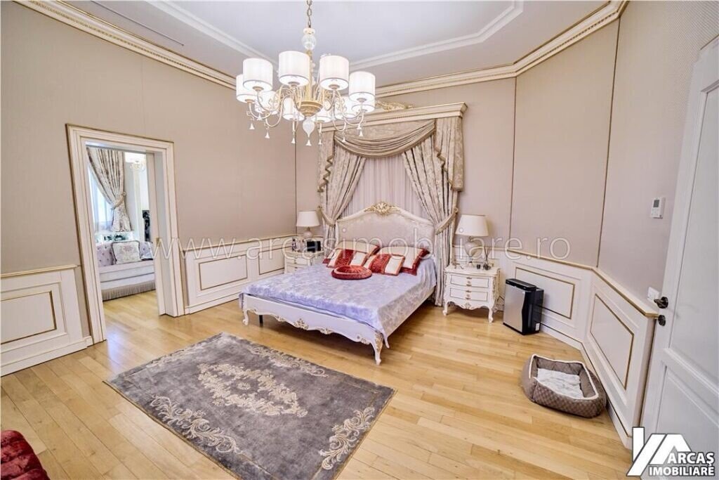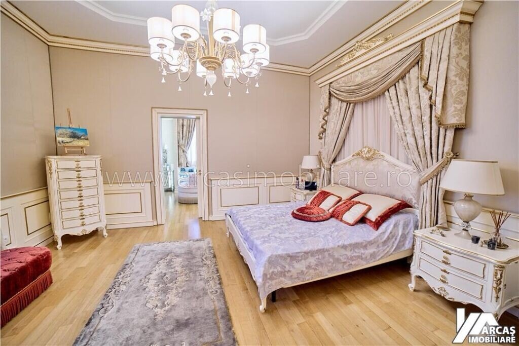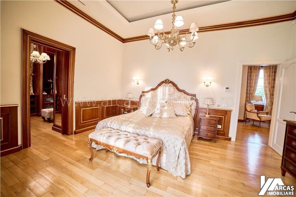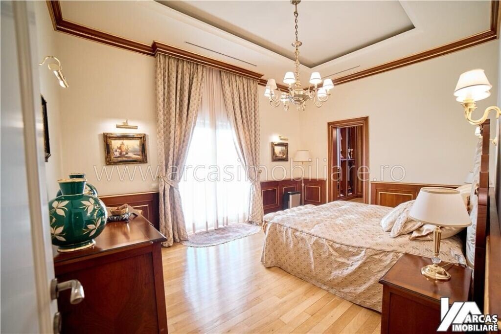 -tamplarie din lemn masiv cu geamuri termopan in 3 canturi, usi din lemn masiv, mobilier din lemn masiv Rositalia, pardoseala din lemn masiv de stejar, corpuri de iluminat Italia, candelabre din stica de Murano, oglinzi sticla Italia, perdele din voal de matase, draperii din matase si catifea.