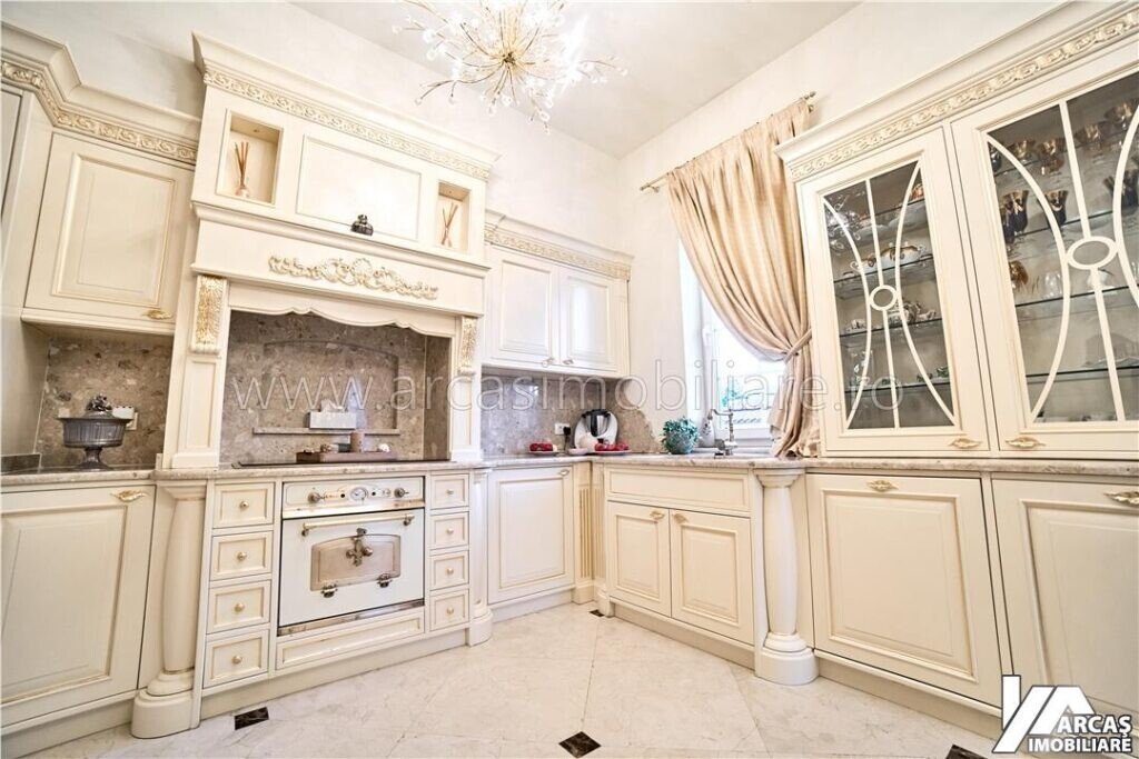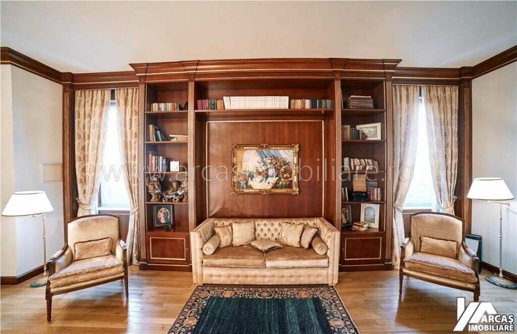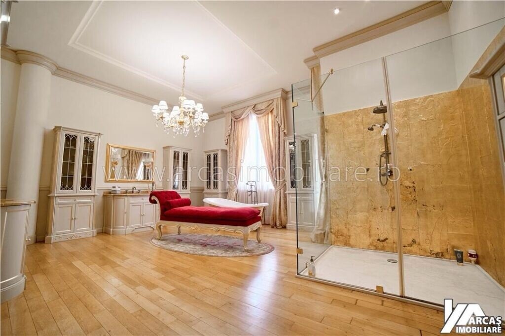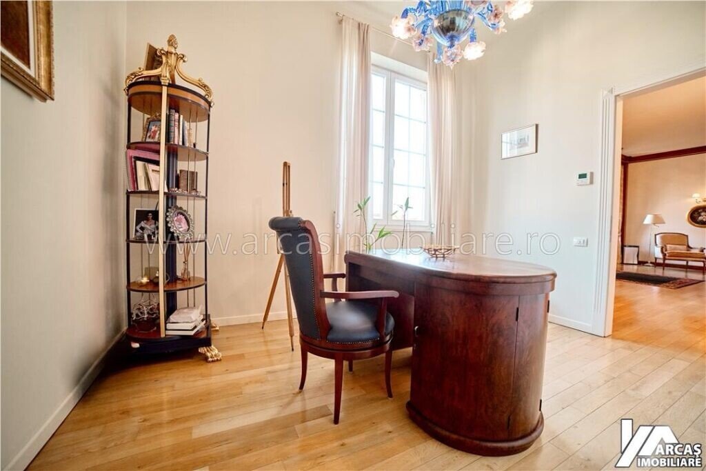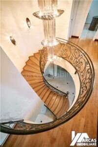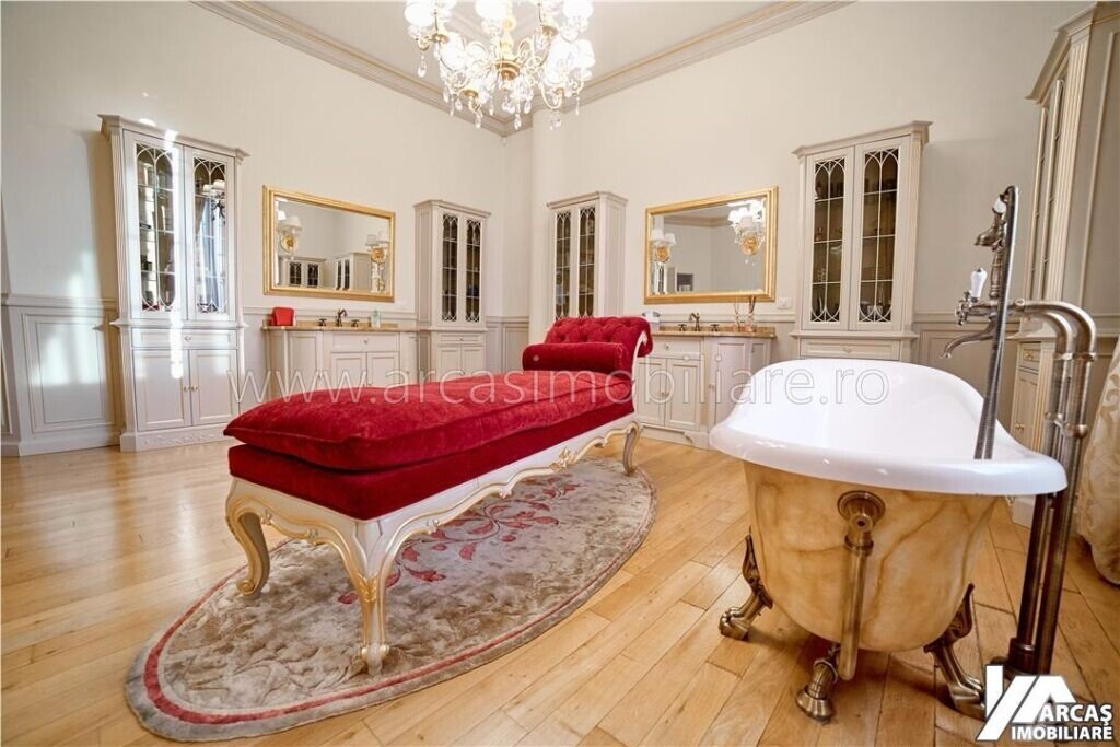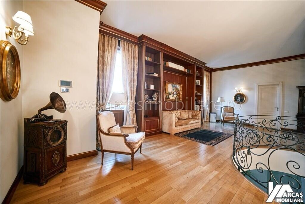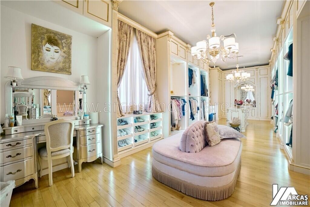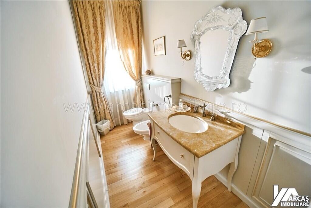 -tamplarie din lemn masiv cu geamuri termopan in 3 canturi, usi din lemn masiv, mobilier din lemn masiv Rositalia, pardoseala din lemn masiv de stejar, corpuri de iluminat Italia, candelabre din stica de Murano, oglinzi sticla Italia, perdele din voal de matase, draperii din matase si catifea.