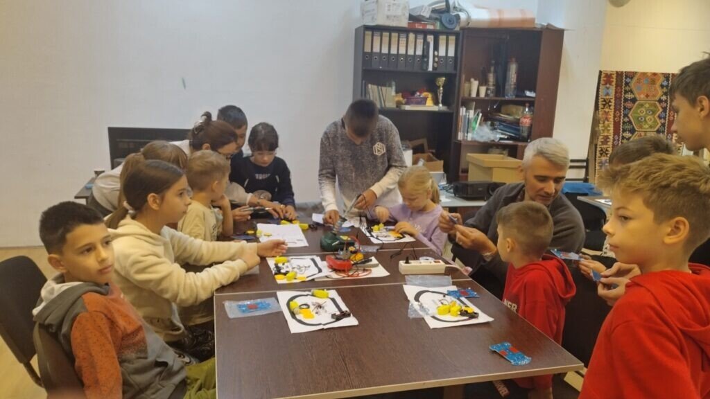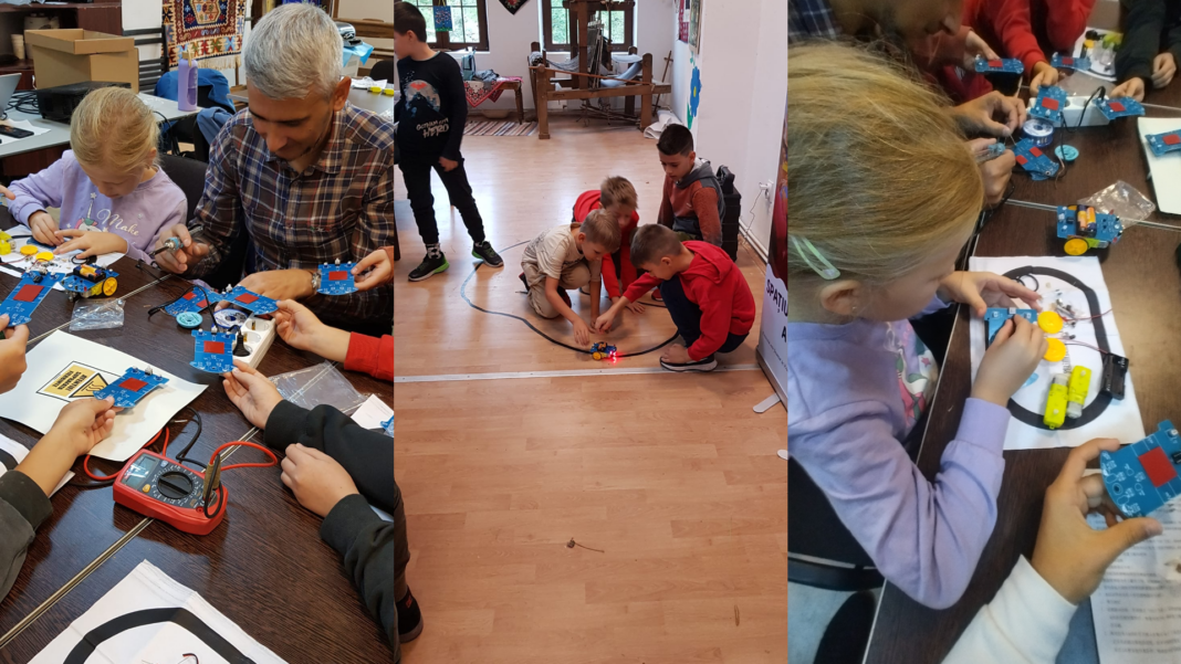 În a doua parte a activității, tinerii au avut ocazia să aplice cunoștințele acumulate în practică, montând kituri de roboți urmăritori de linie. Aceștia au învățat tehnica cositoririi componentelor pe plăcile de circuit imprimat, pregătindu-se pentru următoarea etapă a atelierului.