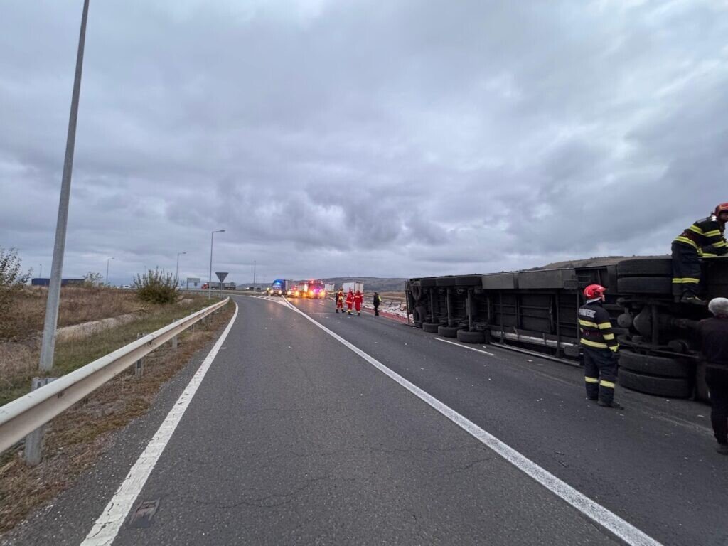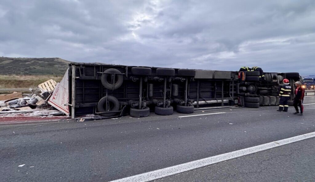 Un autocamion s-a răsturnat, în această dimineață, pe autostrada A1, sensul de mers Sebeș – Sibiu.