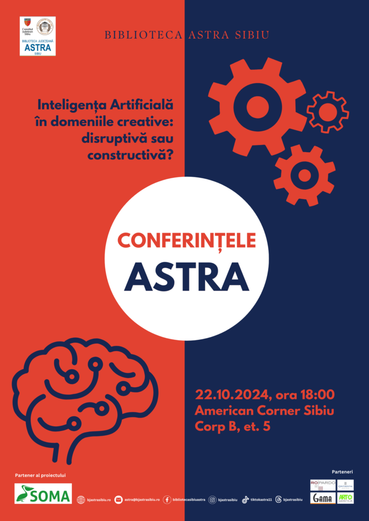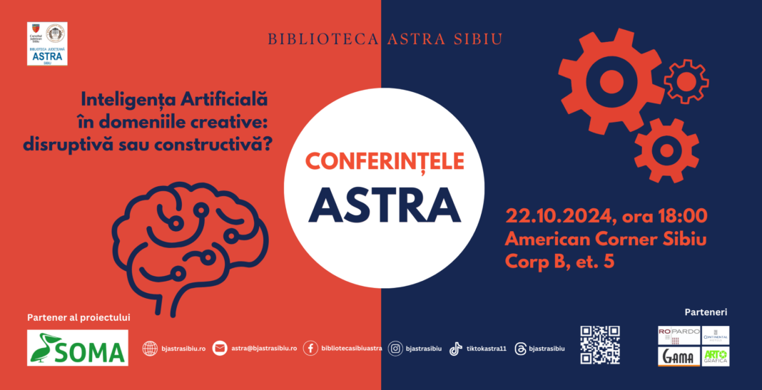 Biblioteca Județeană ASTRA Sibiu organizează o nouă întâlnire publică în cadrul proiectului cultural „Conferințele ASTRA”, în data de 22 octombrie 2024, de la ora 18:00. Sub tema „Inteligența Artificială în domeniile creative: disruptivă sau constructivă?”, evenimentul va aduce în discuție rolul tehnologiilor AI în creația artistică și efectele pe care le au asupra domeniilor creative, oferind perspective diverse asupra acestui subiect complex și de actualitate. Evenimentul va avea loc în spațiul American Corner Sibiu, situat la etajul 5 al instituției de cultură care beneficiază de sprijin financiar din partea Consiliului Județean Sibiu.