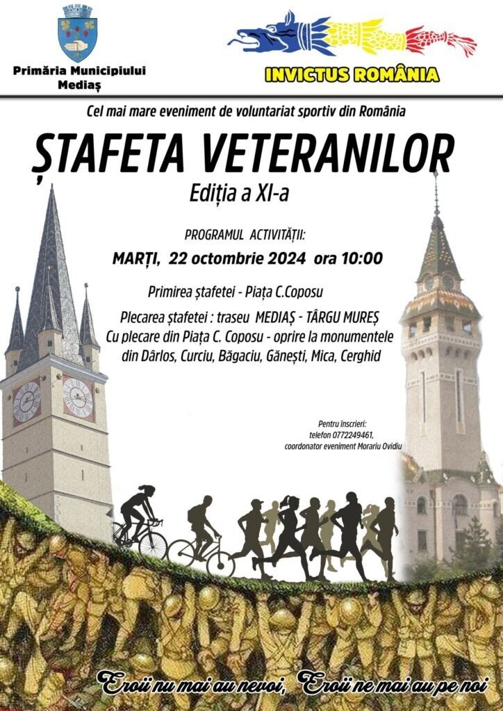 În data de 22 octombrie 2024, municipiul Mediaș va găzdui evenimentul sportiv și caritabil intitulat ,,Ștafeta Veteranilor“, proiect derulat sub egida Invictus România. Manifestarea, aflată la cea de-a XI-a ediție națională, se desfășoară pentru al treilea an consecutiv în municipiul nostru și este dedicată valorilor naționale, memoriei veteranilor de război și militarilor răniți în teatrele de operații militare.