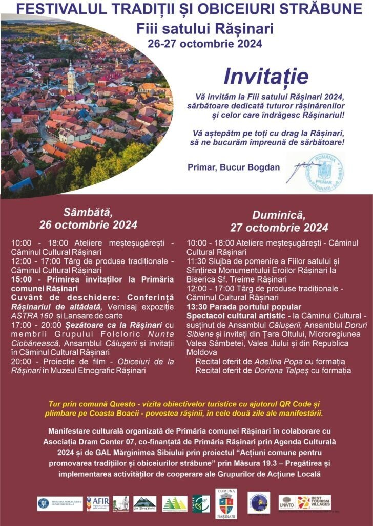 Manifestare culturală organizată de Primăria Rășinari în colaborare cu Asociația Dram Center 07 și co-finanțată de Primăria Rășinari prin Agenda Culturală 2024 și de GAL Mărginimea Sibiului în cadrul proiectului Acțiuni comune pentru promovarea tradițiilor și obiceiurilor străbune prin Măsura 19.3 Pregătirea și implementarea activităților de cooperare ale Grupurilor de Acțiune locală.