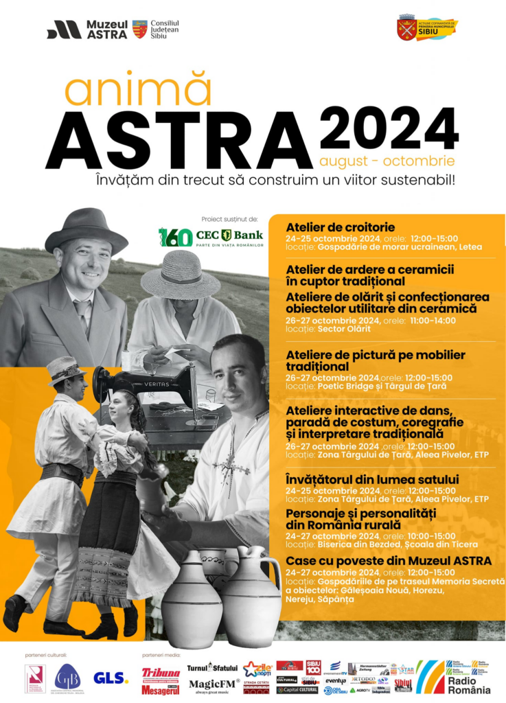 Finalul de octombrie duce multă culoare și tradiție la Muzeul ASTRA, cu ocazia evenimentului “Culorile toamnei cu ANIMĂ ASTRA”. În perioada 24-27 octombrie, vizitatorii sunt invitați să participe la ateliere interactive de creație, dans și să descopere poveștile fascinante ale satului românesc din secolele XIX-XX.