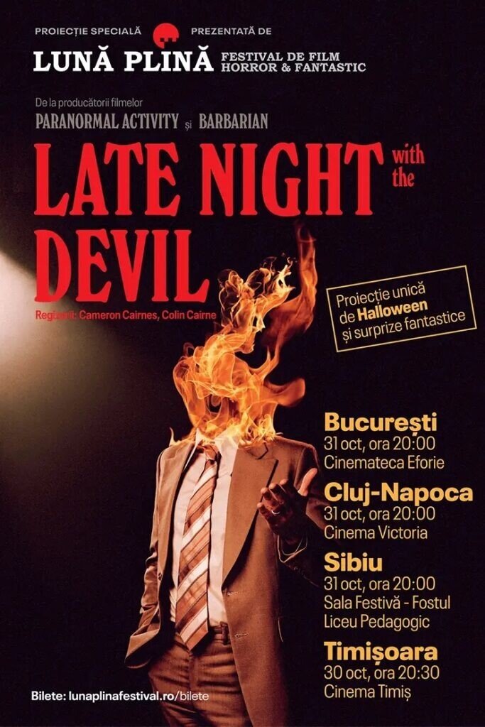Este unul dintre cele mai bune horror-uri ale anului, cu elemente de satiră și comedie, smart și cinic, apreciat deopotrivă de critici și de publicul din SUA, iar tu ai șansa să-l vezi într-o singură proiecție de Halloween joi, 31 octombrie, de la ora 20:00 „Late Night with the Devil” (r. Cameron Cairnes, Colin Cairnes, 2024, SUA) în Sala Festivă – Fostul Liceu Pedagogic, Sibiu.