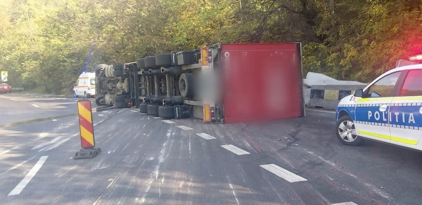 Trafic îngreunat pe Valea Oltului. S-a răsturnat un camion