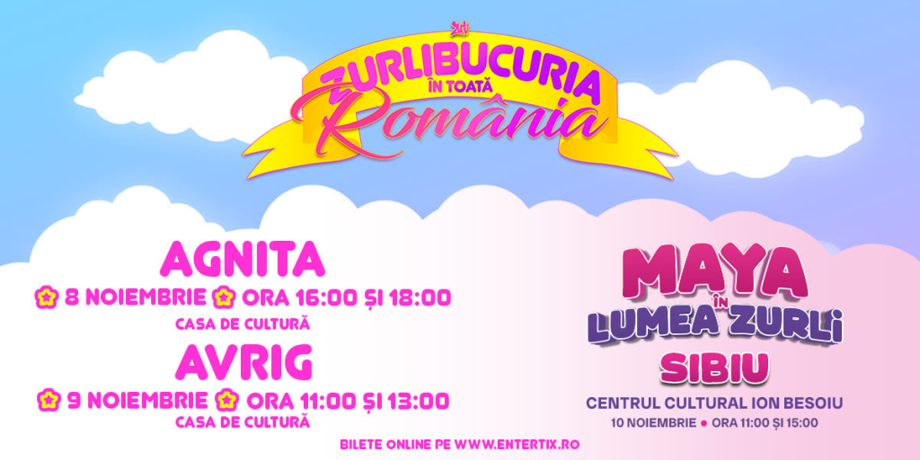 ”ZurliBucuria”, spectacolul cu care Tanti Prezentatoarea, Maya și personajele Zurli au fost deja în 33 de orașe mici din România, ajunge în județul Sibiu. Prima oprire a Caravanei Zurli va fi la Casa de Cultură din Agnita, pe 8 noiembrie, unde vor avea loc două spectacole, de la ora 16:00 și de la ora 18:00. A doua zi, pe 9 noiembrie, ZurliBucuria va fi în Avrig, de la ora 11:00 și de la ora 13:00, la Casa de Cultură. â