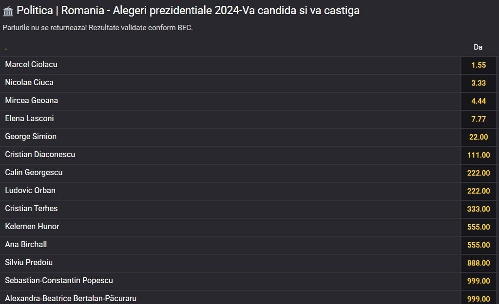 Prima șansă de a deveni președinte o are Marcel Ciolacu (PSD) cu o cotă de 1.55. Pe locul 2 se situează Nicolae Ciucă (PNL) cu 3.33, urmat de Mircea Geoană cu 4.44, Elena Lasconi (USR) 7.77 și George Simion (AUR) abia cu a cincea șansă cu o cotă mare de 22.00.