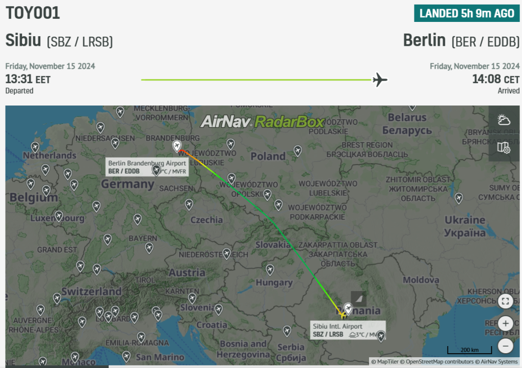 Președintele Iohannis nu renunță nici în ultimele sale zile de mandat la călătoriile cu avioane private. Astăzi, 15 noiembrie, președintele a venit la Sibiu, de unde a plecat cu un avion privat la Berlin. Avionul a decolat la ora 13.31 din Sibiu și a aterizat la 14.08 la Berlin, ora locală. Iohannis a apelat la firma Toyo Aviation din România pentru a închiria un avion model Embraer ERJ 135BJ Legacy 600 (foto).