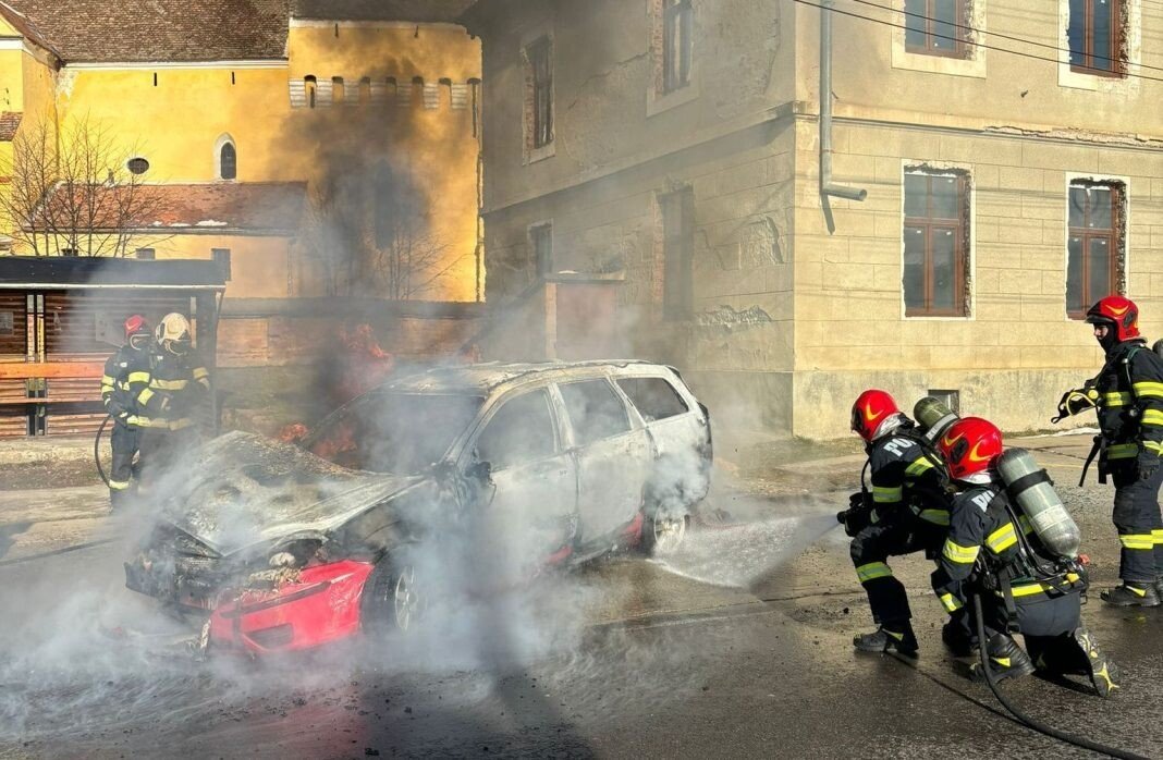 Pompierii sibieni au intervenit de urgență în localitatea Șura Mare pe strada Principală pentru stingerea unui incendiu la un autoturism.