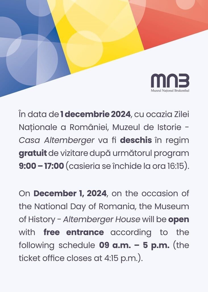 În data de 1 decembrie 2024, cu ocazia Zilei Naționale a României, muzeele din cadrul Muzeului Național Brukenthal vor fi deschise spre vizitare. Intrarea la Muzeul de Istorie Casa Altemberger va fi în regim gratuit.