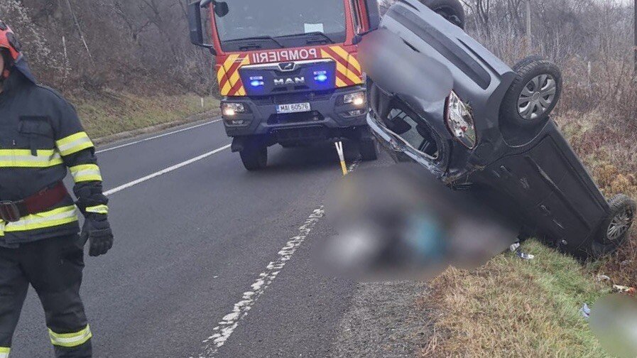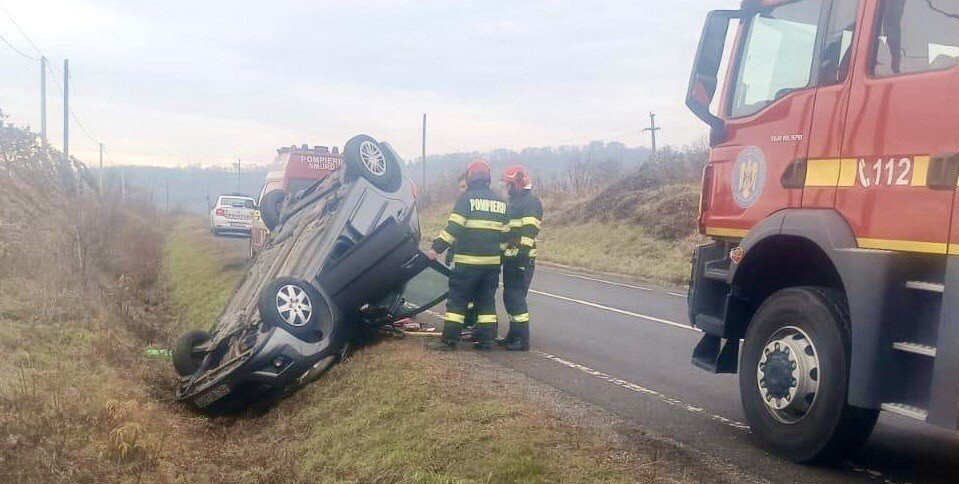 În această dimineață, o șoferiță în vârstă de 43 de ani, în timp ce conducea o mașină în afara localității sibiene Hoghilag, a pierdut controlul direcției de deplasare și s-a răsturnat.