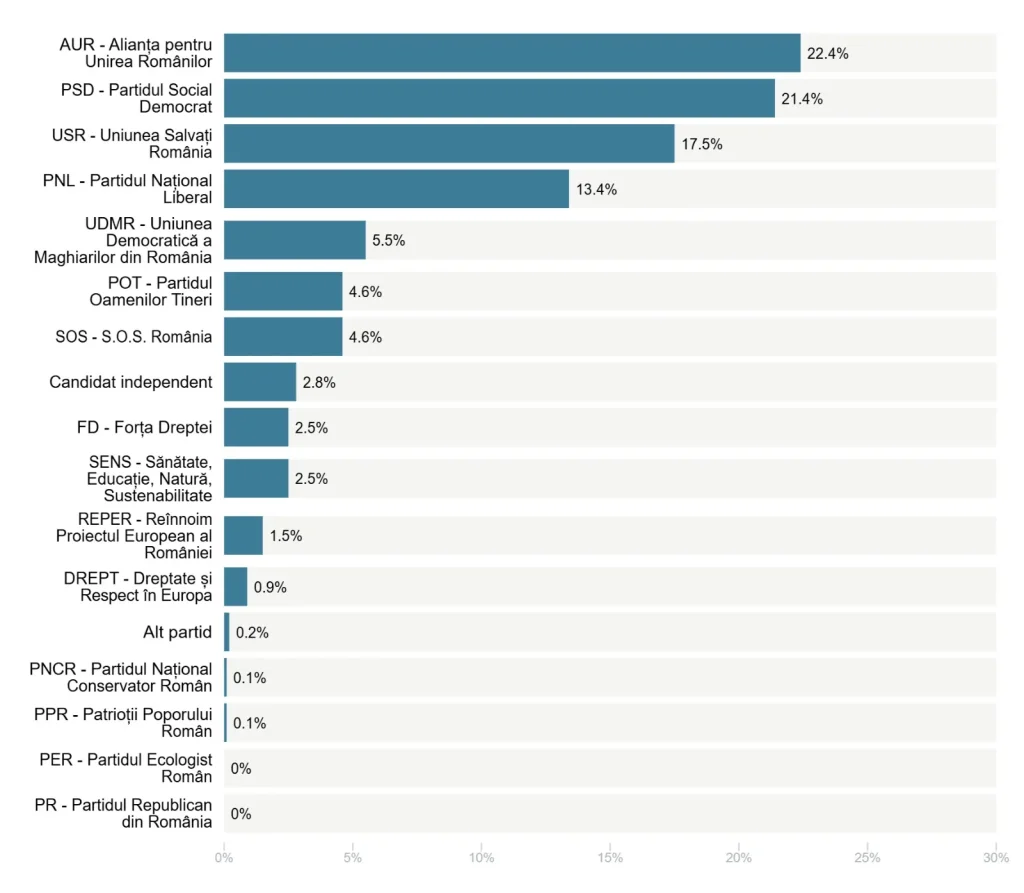 PSD este pe locul 2 cu 21,4%, urmat de USR cu 17,5%, PNL cu 13,4% și UDMR cu 5,5%.