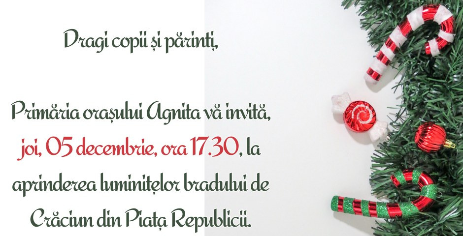 Primăria orașului Agnita îi invită pe toți copiii, părinții și locuitorii orașului să participe joi, 5 decembrie, de la ora 17:30, la un eveniment special dedicat sărbătorilor de iarnă. În Piața Republicii, va avea loc ceremonia de aprindere a luminilor bradului de Crăciun, moment ce marchează oficial debutul atmosferei festive în oraș.