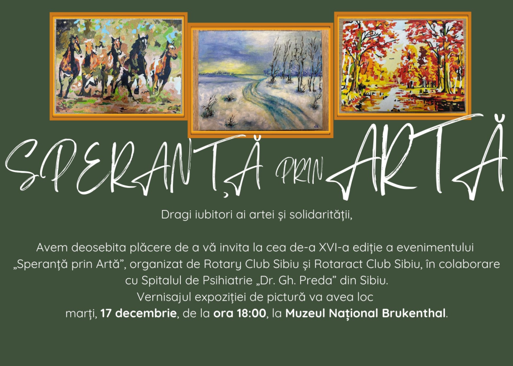 17 decembrie 2024, ora 18:00– Muzeul Brukenthal devine gazda unei seri cu totul speciale, dedicată artei și solidarității. Cea de-a XVI-a ediție a evenimentului „Speranță prin artă”, organizată de Rotary Club Sibiu și Rotaract Club Sibiu, în parteneriat cu Spitalul Clinic de Psihiatrie „Dr. Gheorghe Preda” Sibiu și Asociația Spitalului Psihiatrie Sibiu, aduce în prim-plan puterea vindecătoare a creației.