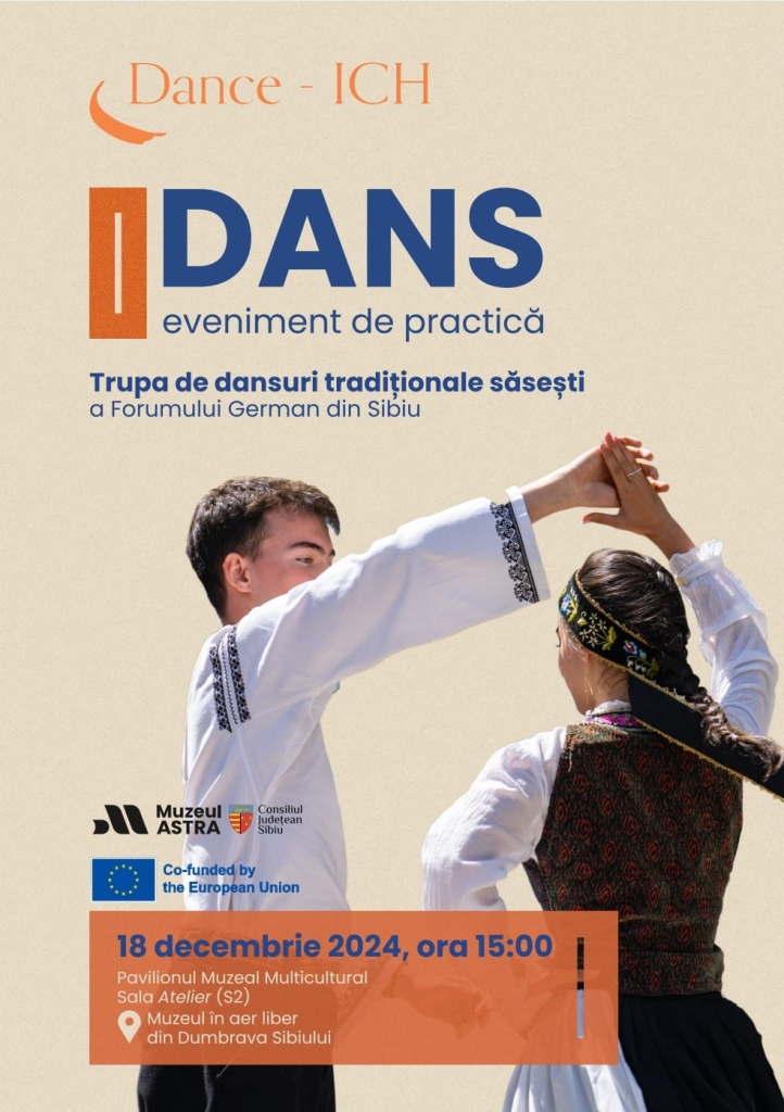 Miercuri, 18 decembrie 2024, între orele 15:00 și 17:00, Muzeul ASTRA Sibiu vă invită la un eveniment special dedicat dansurilor tradiționale săsești, susținut de trupa Forumului German din Sibiu. În cadrul atelierului, participanții vor avea ocazia să învețe și să danseze alături de tinerii dansatori pasionați, redescoperind dansuri autentice din Transilvania, precum Hettlinger, Kreuzpolka și Americans.