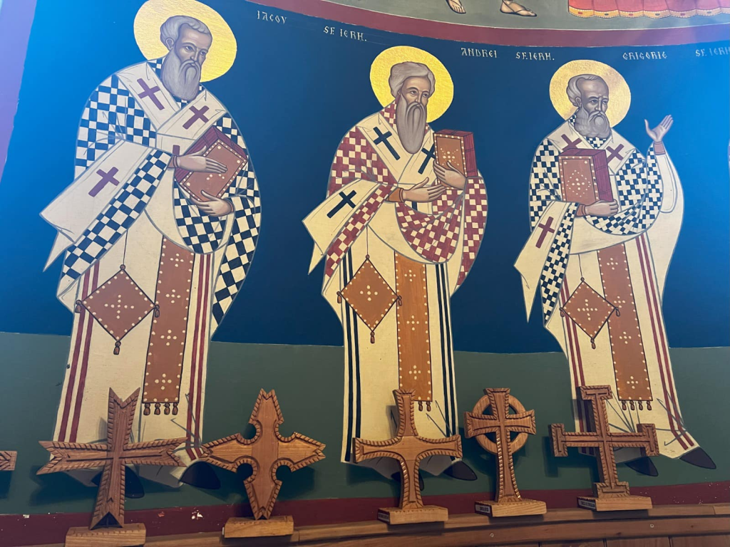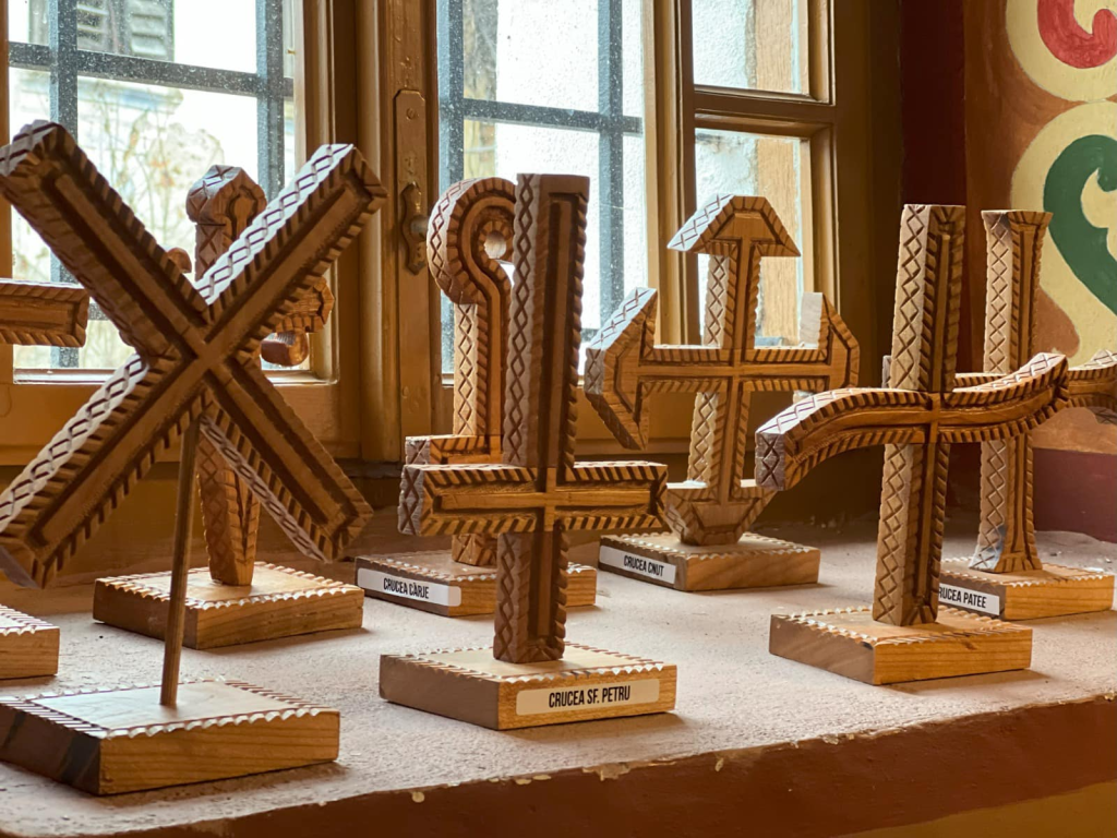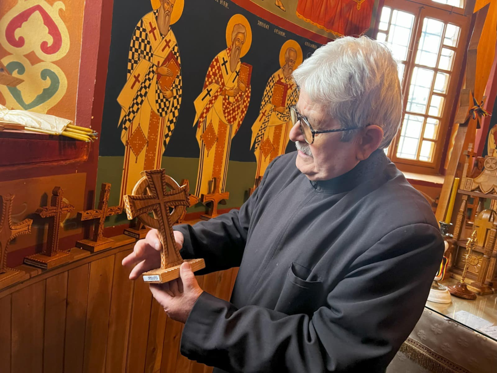 Pentru sculpturile sale, părintele folosește lemnul de cireș. Cu migală, răbdare și un permanent zâmbet pe chip, a transformat bucățile de lemn în simbolul credinței. „Aceasta este crucea regelui Knot, aceasta este crucea celtică, cea de lângă este malteză, iar următoarea este cea a Sfântului Florian, care este și patronul spiritual al pompierilor.” Rând pe rând, cele 80 de cruci așezate deasupra iconostasului sau pe pervazul geamurilor, își dezvăluie simbolistica, fiecare având în spate o pildă de înțelepciune și un sfat pentru privitor.