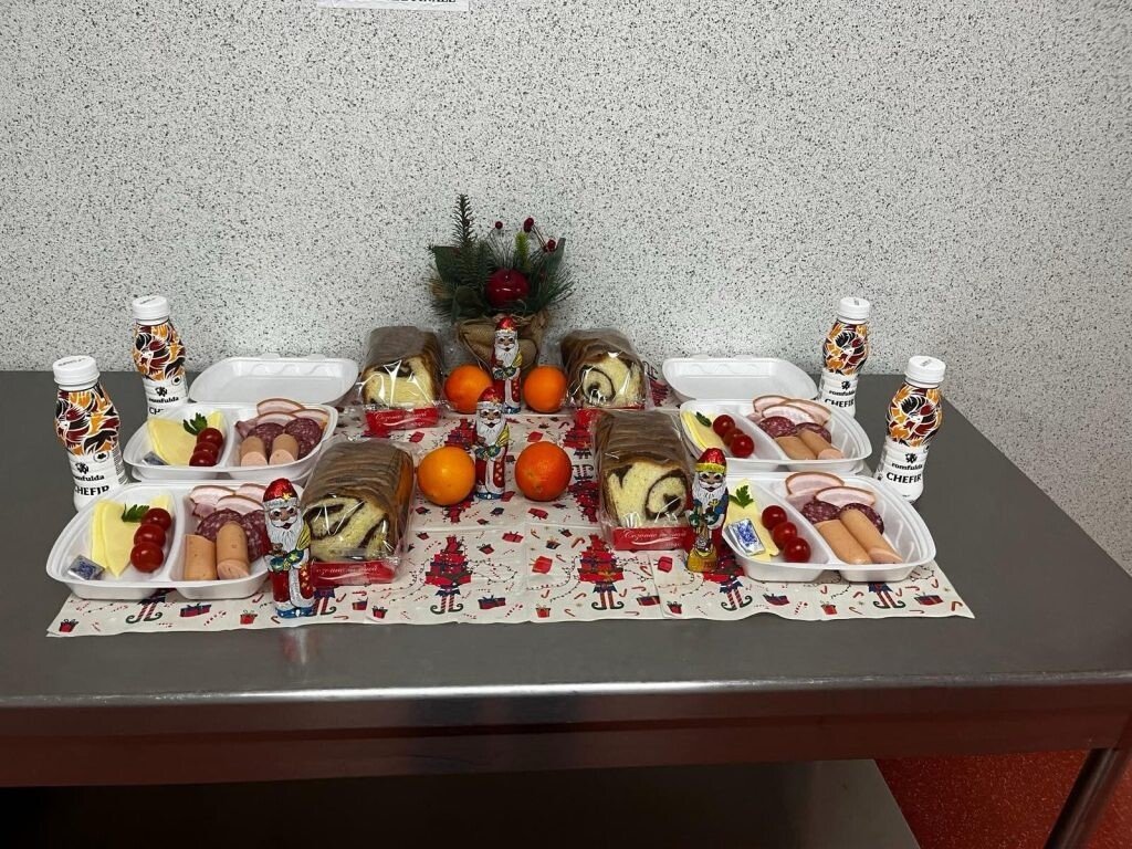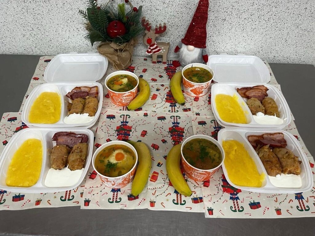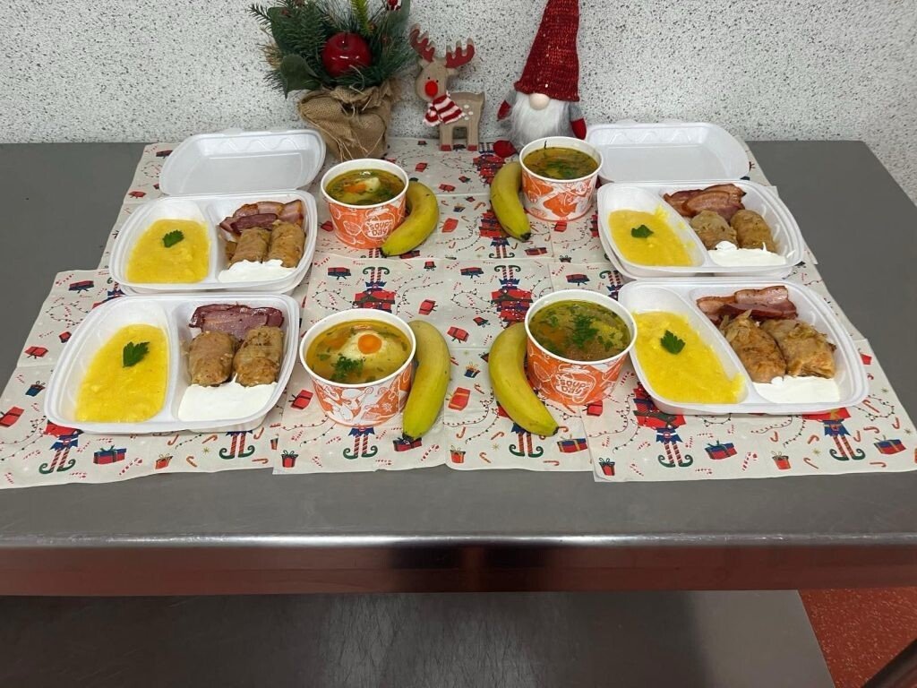 Printre bunătățile preparate în Blocul alimentar al spitalului pentru a fi servite pacienților s-au numărat mămăliguța cu sarmale și smântână, supa cu găluște și friptura de porc. De asemenea, de pe masa pacienților noștri nu au lipsit nici cozonacul cu nucă, checul, portocalele și figurinele de ciocolată de sezon.