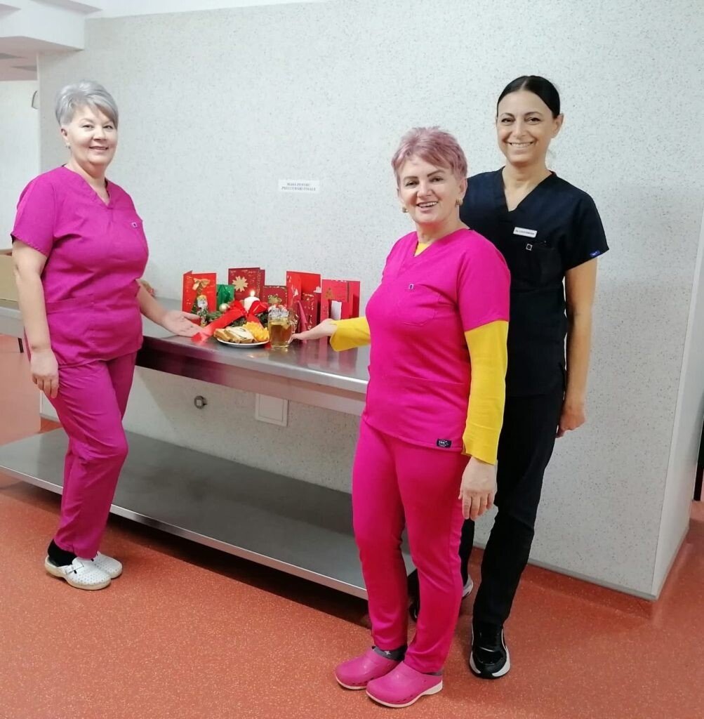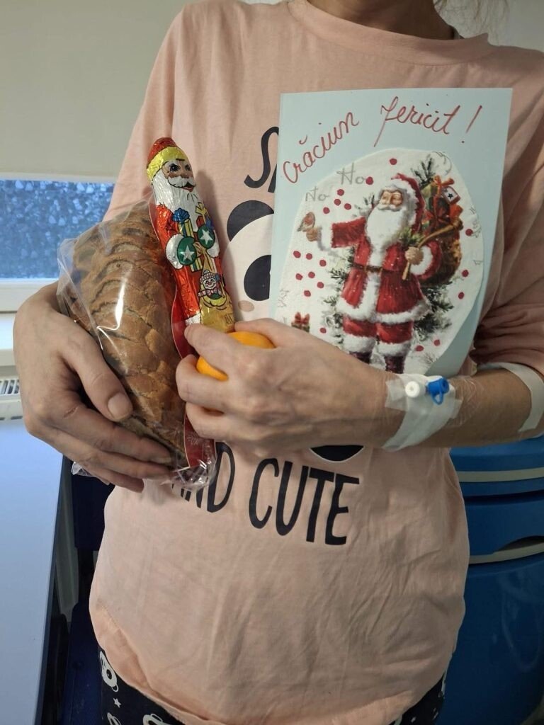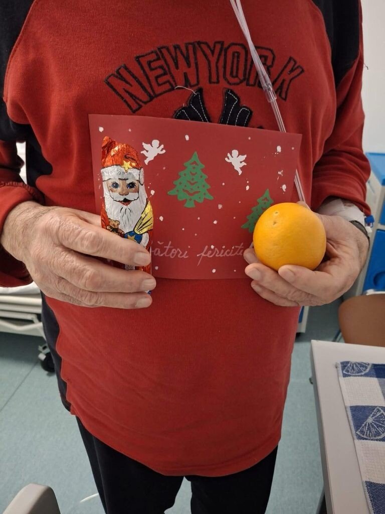 Meniu de sărbătoare pentru pacienții internați în Spitalul de Pneumoftiziologie Sibiu. Cozonac, portocale, sărmăluțe, figurine din ciocolată și felicitări dăruite pacienților de Crăciun