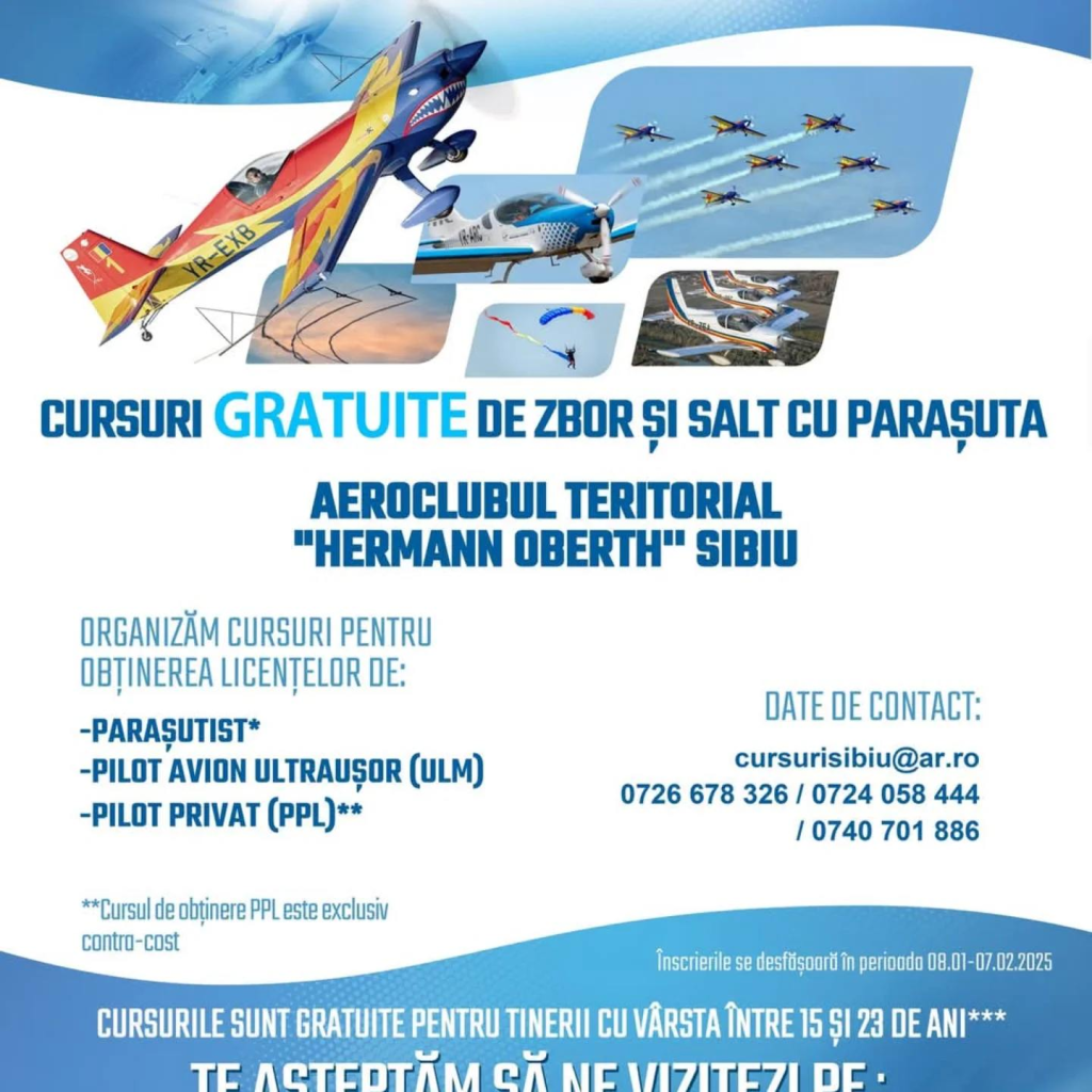 Aeroclubul Teritorial Sibiu „Hermann Oberth” a dat startul înscrierilor pentru cursurile gratuite de zbor și parașutism, oferindu-le tinerilor între 15 și 23 de ani șansa de a descoperi bucuria și adrenalina aventurii aeriene. Procesul de înscriere se desfășoară exclusiv online, în perioada 8 ianuarie – 7 februarie 2025, pe platforma oficială: https://legitimare.ar.ro.