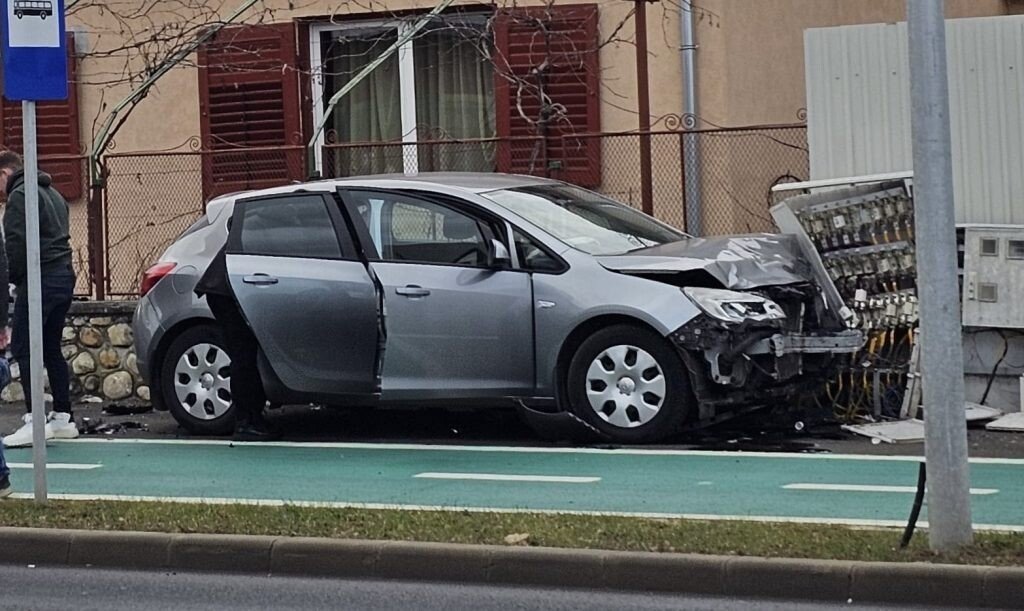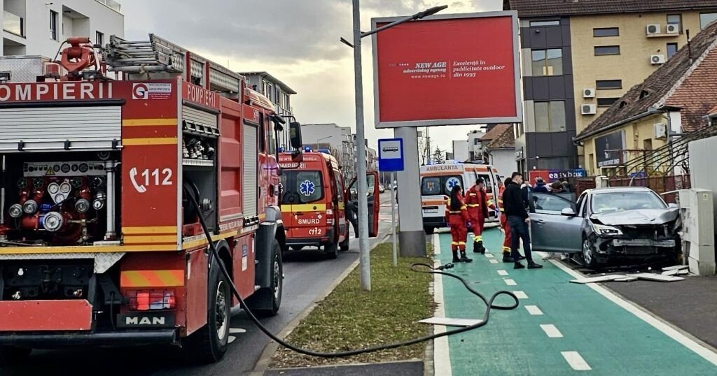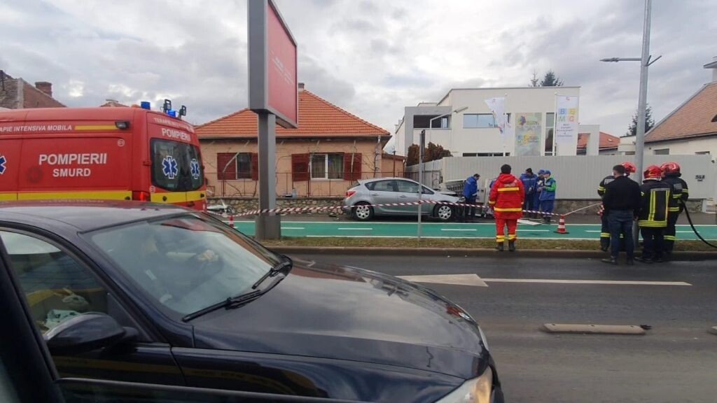 Accident rutier pe Calea Dumbrăvii din municipiul Sibiu, acolo unde o mașină a rupt și un tablou electric.